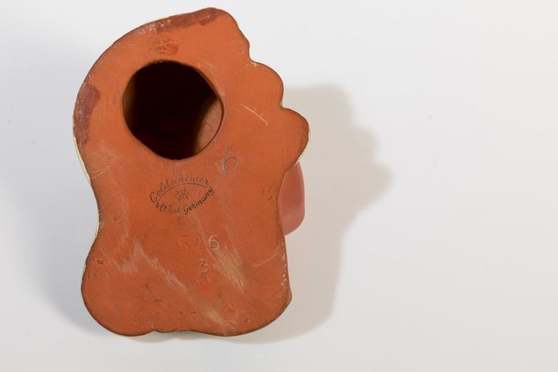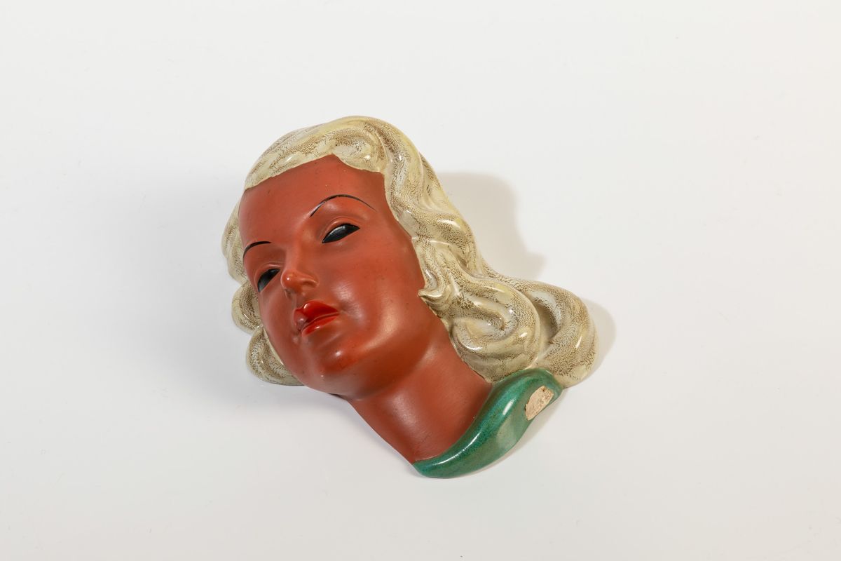 Testa di donna in ceramica con decoro a smalti policromi.
