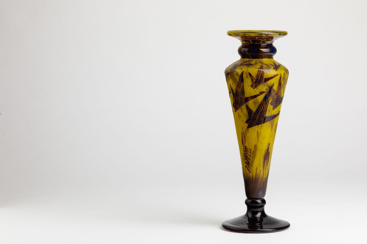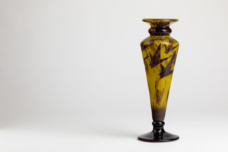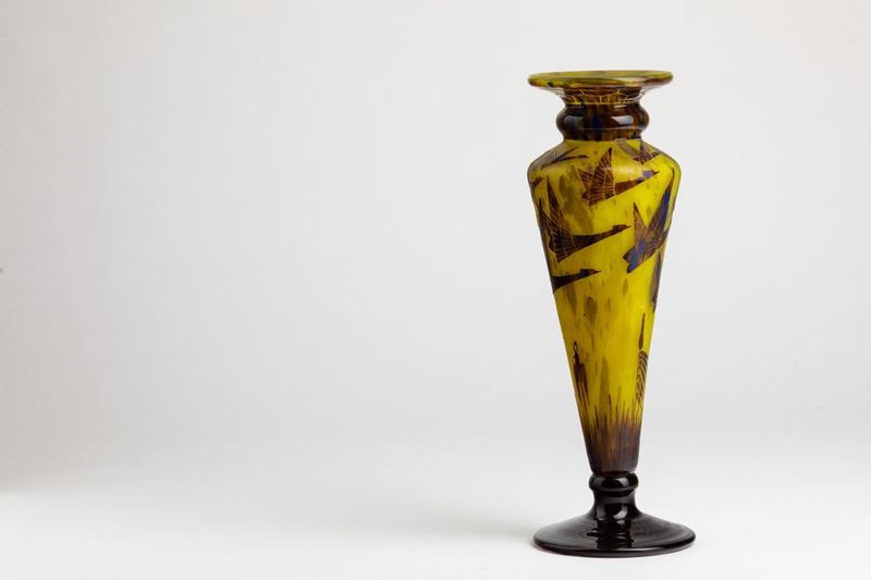 Vaso a balaustro in vetro a cammeo con decoro di aironi in volo.