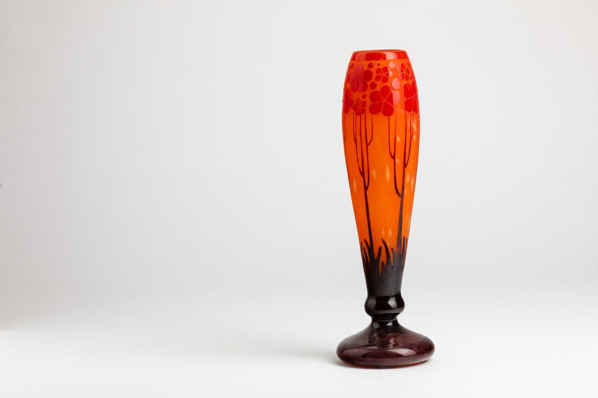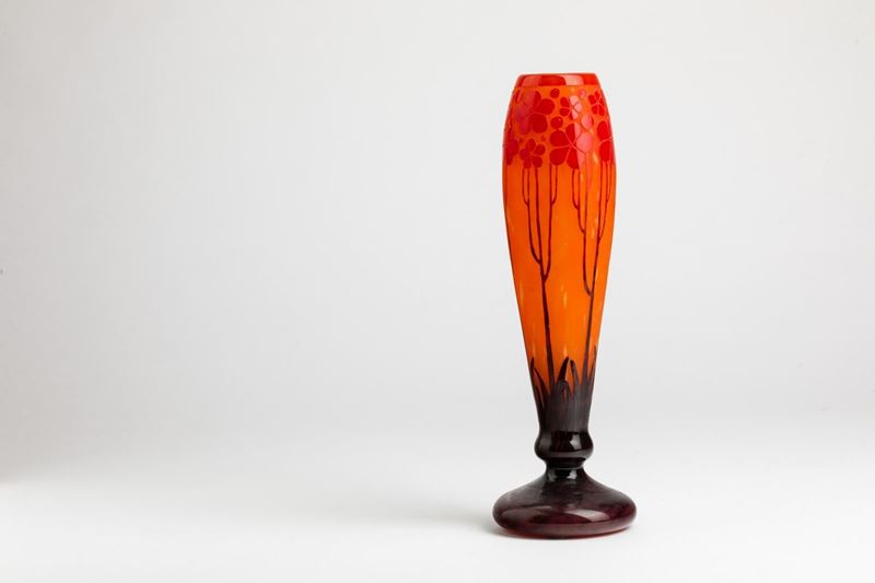 Vaso a balaustro su piede a bulbo in vetro a cammeo a decoro floreale.