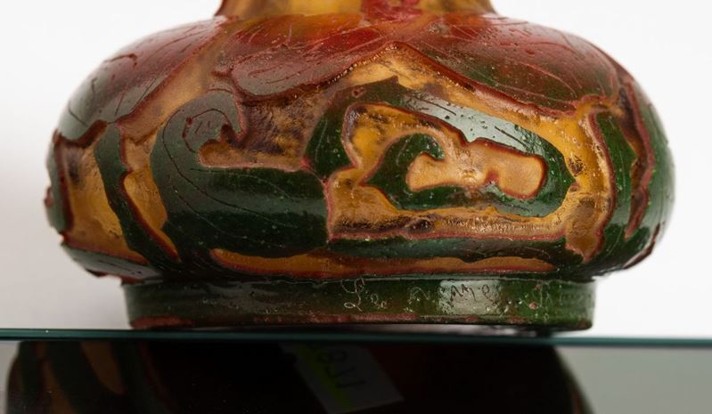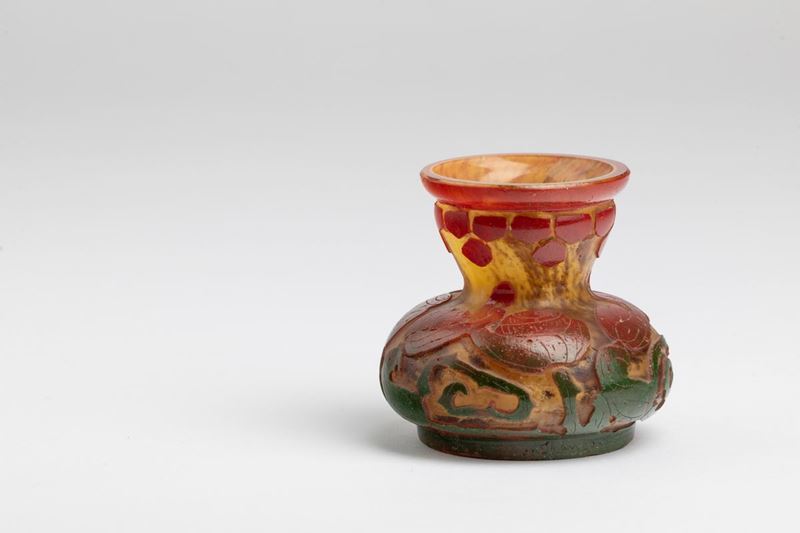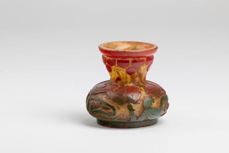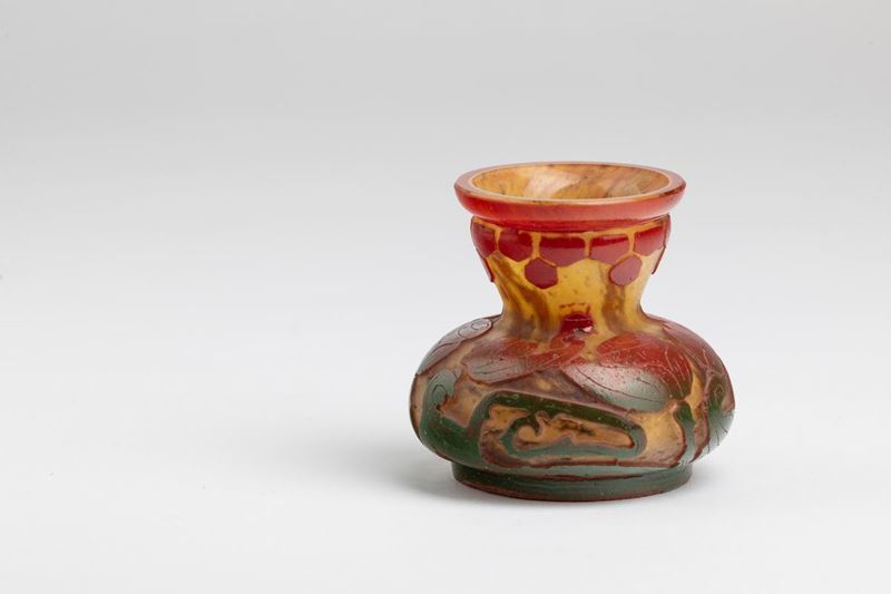 Piccolo vaso a balaustro con decoro floreale a cammeo di forte spessore.