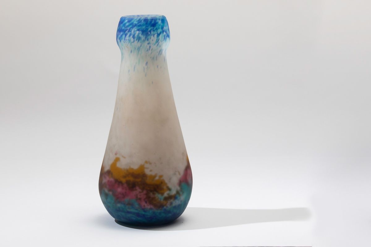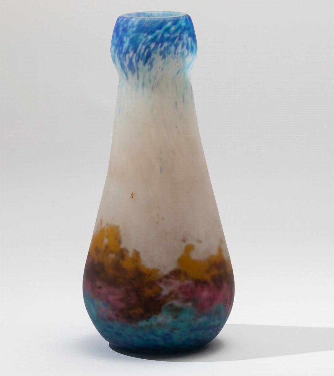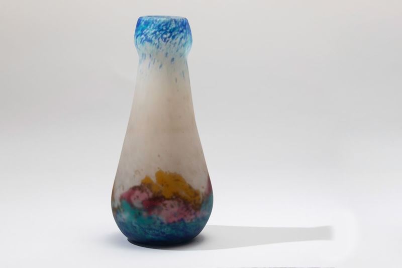 Vaso in vetro sabbiato con decoro multicolore.