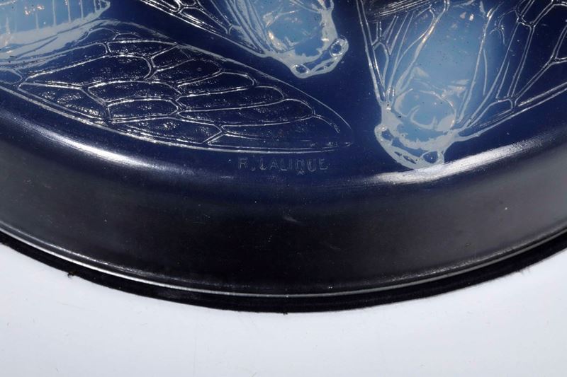 Scatola in cartone pressato con coperchio in vetro opalescente a decoro di insetti.
