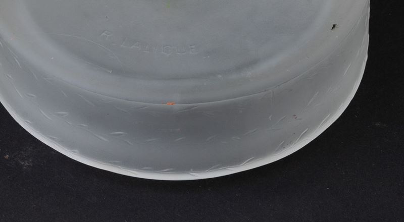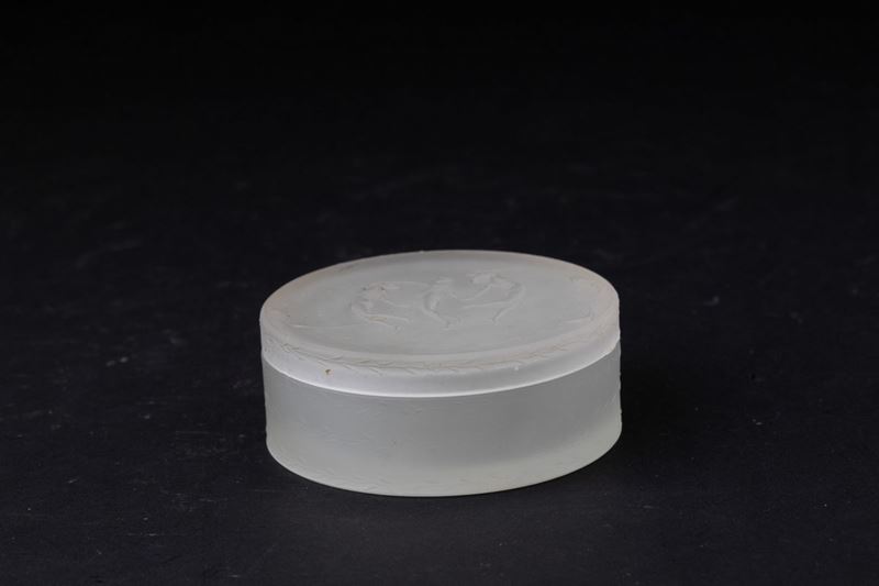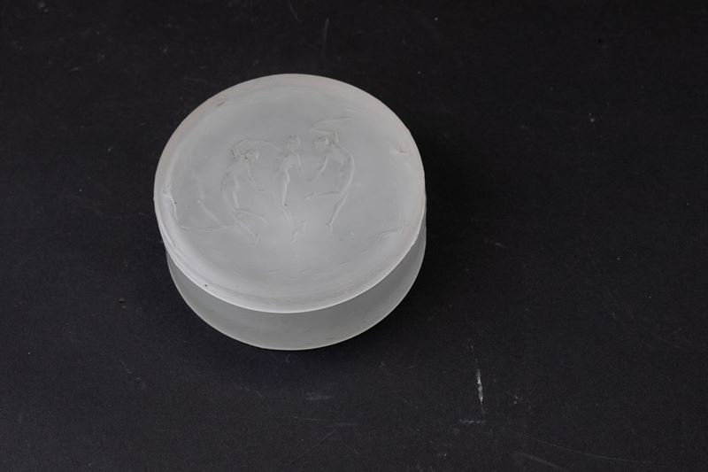 Scatola per d’Orsay modello Trois Figurines in vetro sabbiato soffiato satinato, sul coperchio decoro di danzatrici.