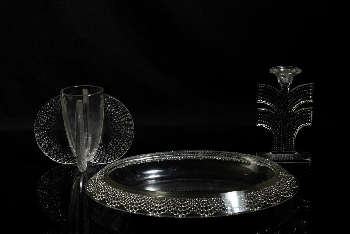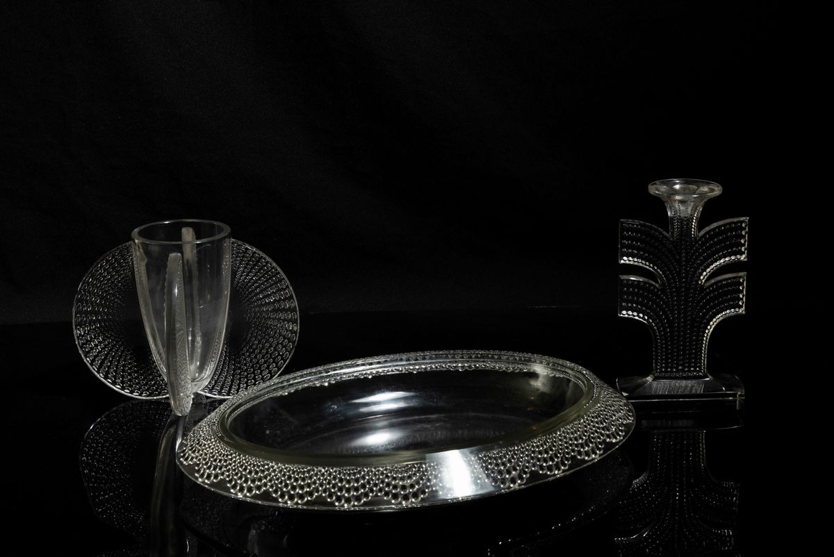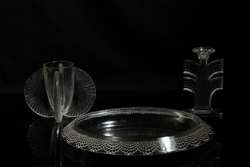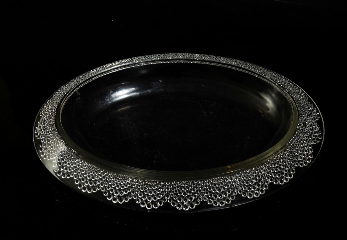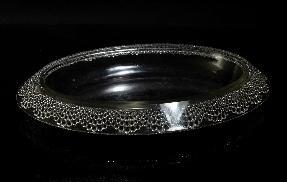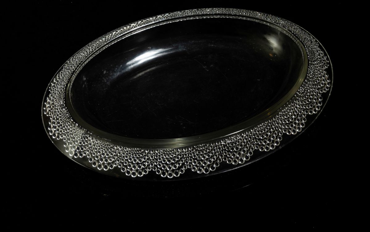 Grande centrotavola ovale modello Tokyo in cristallo stampato con decoro di fascia a goccia.