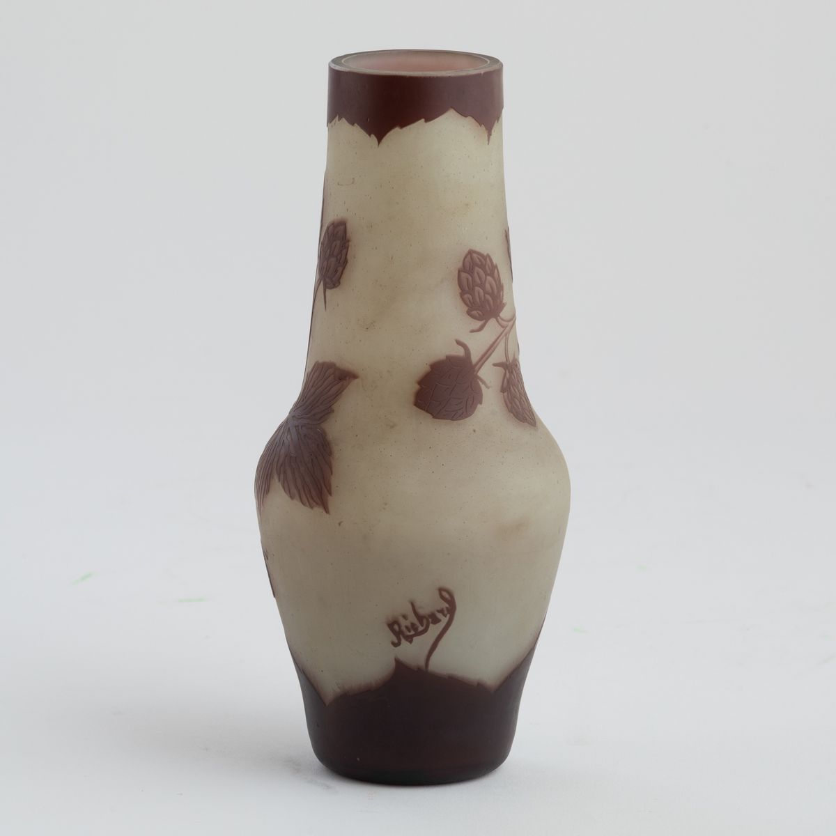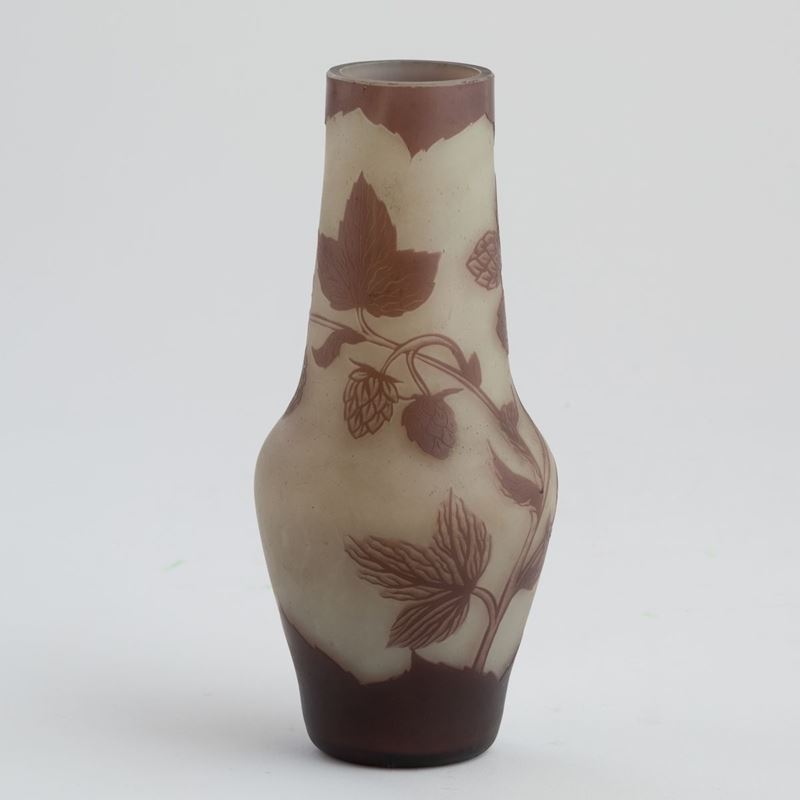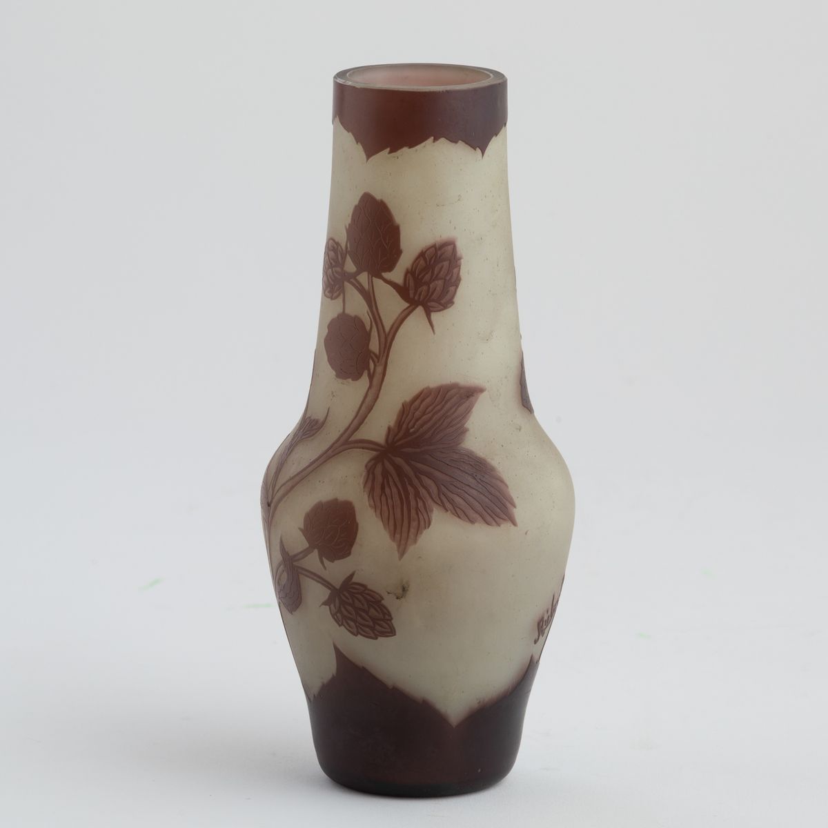 Vaso in vetro a cammeo con decoro floreale e bacche. Firma a rilievo