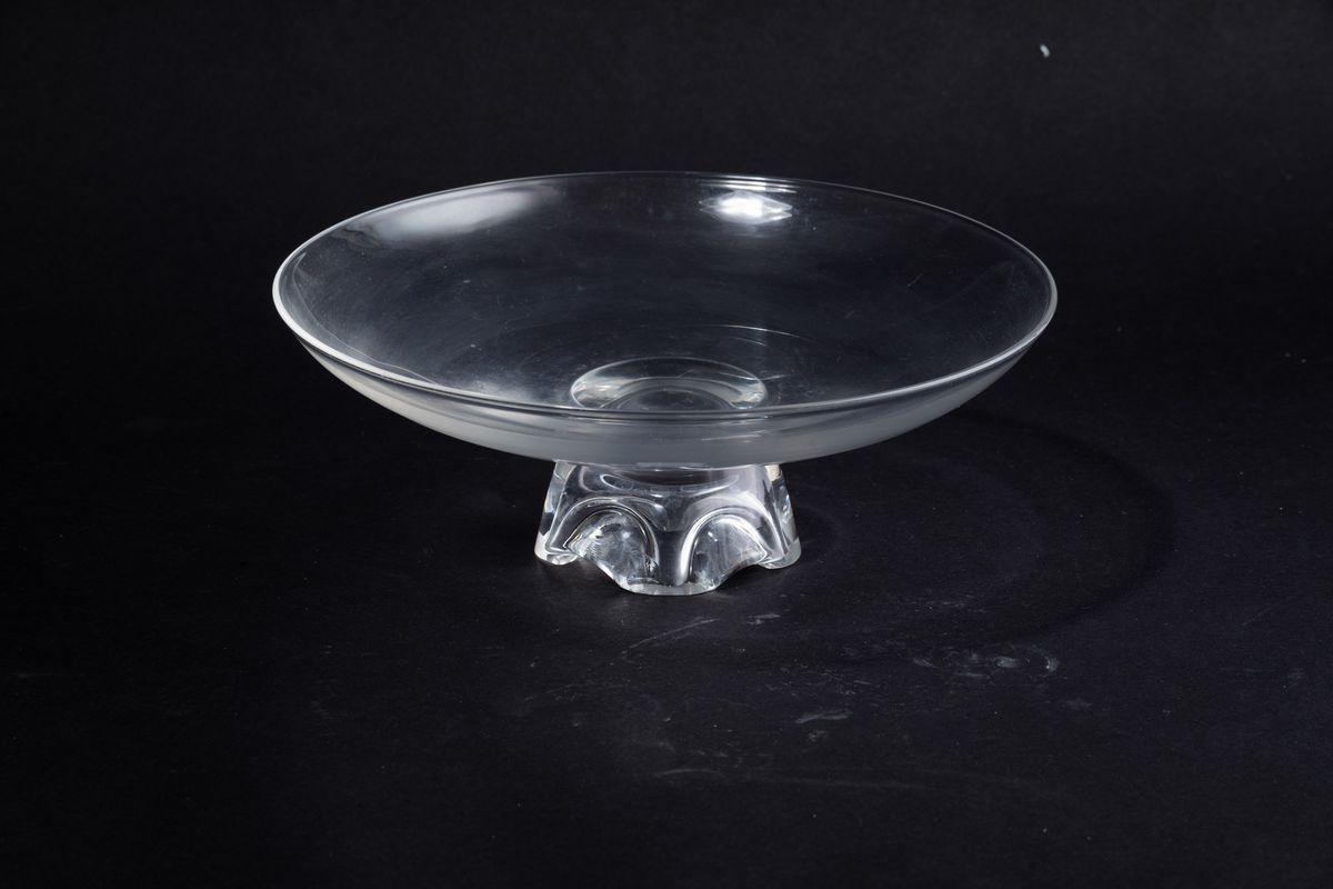 Alzata in cristallo soffiato su basamento a ricciolo.