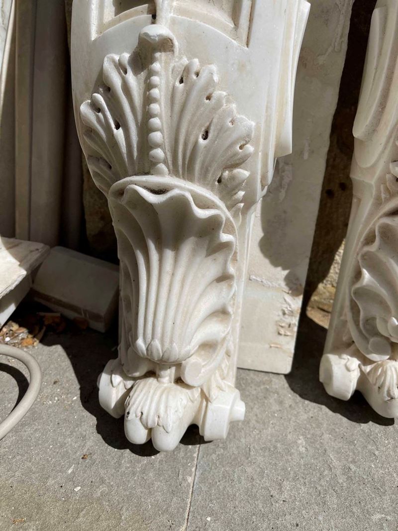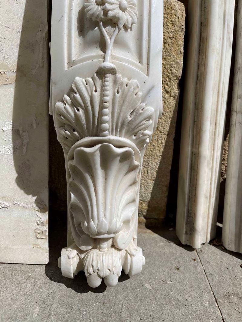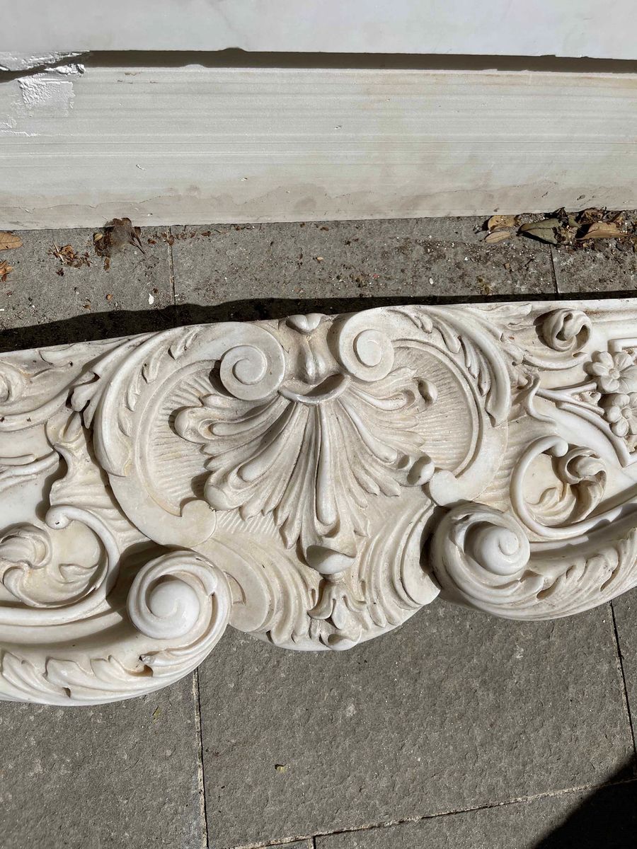 Fregio superiore scolpito a valva di conchiglia, volute e foglie