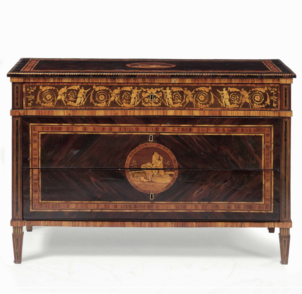 Lastronato in palissandro e bois de rose. Due cassetti senza traverse sormontati da un cassetto più piccolo impreziosito da fregio a motivo di girali di foglie d’acanto intervallate da figure di fauno e ninfa. Fronte e fianchi centrati da intarsi in differenti essenze pregiate entro riserve circolari