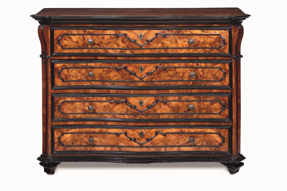 Cassettone lastronato in noce e radica di noce. Lombardia, XVIII secolo