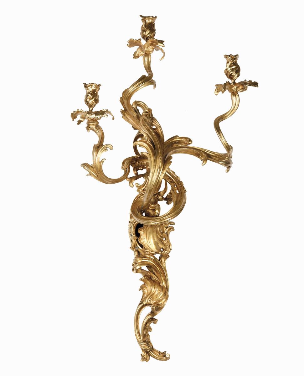 Coppia di appliques a tre luci in bronzo fuso, cesellato e dorato. XX secolo