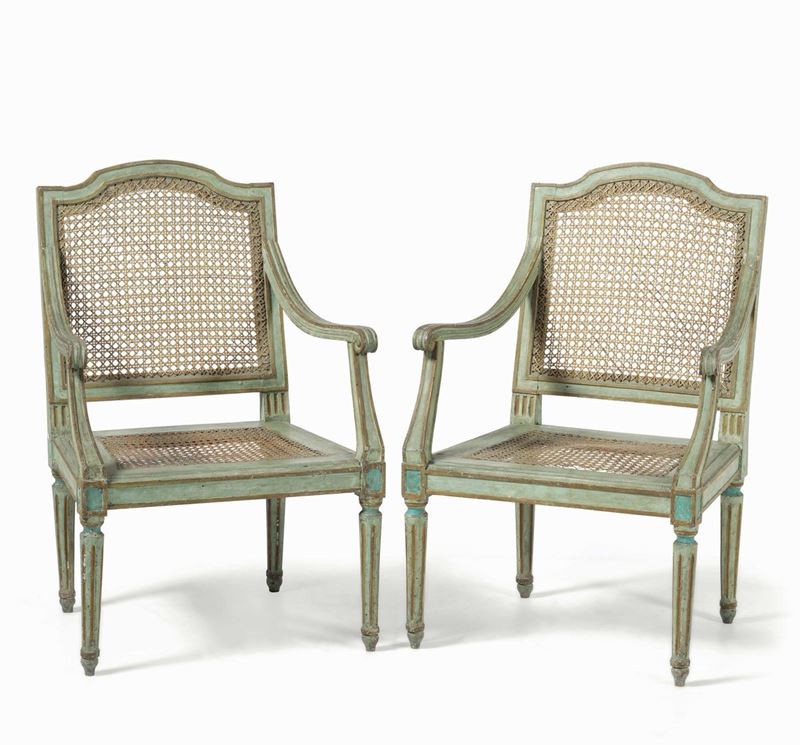 Coppia di poltrone in legno intagliato e laccato con profili dorati. Italia XVIII secolo