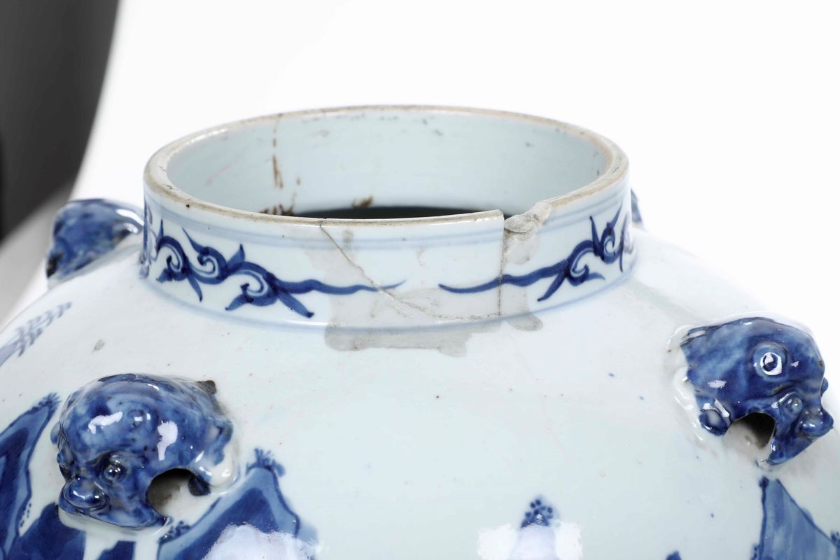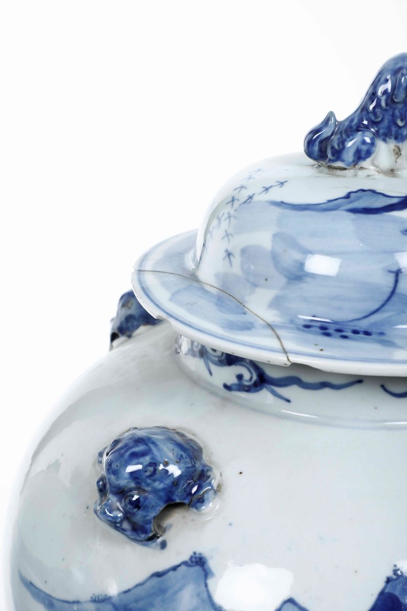 Coppia di potiches in porcellana bianca e blu con raffigurazioni di paesaggi, mascheroni e presa del coperchio a foggia di Cani di Pho, Cina, Dinastia Qing, XIX secolo