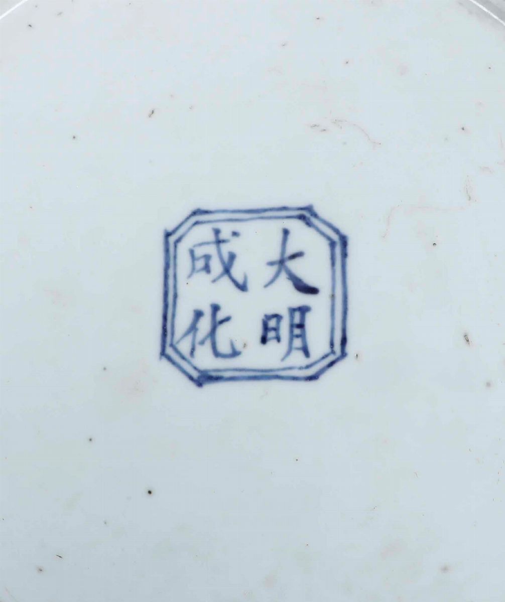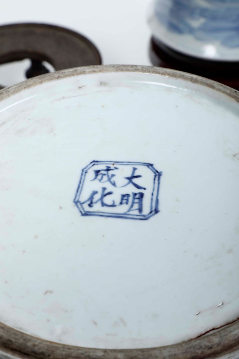 Coppia di potiches in porcellana bianca e blu con raffigurazioni di paesaggi, mascheroni e presa del coperchio a foggia [..]