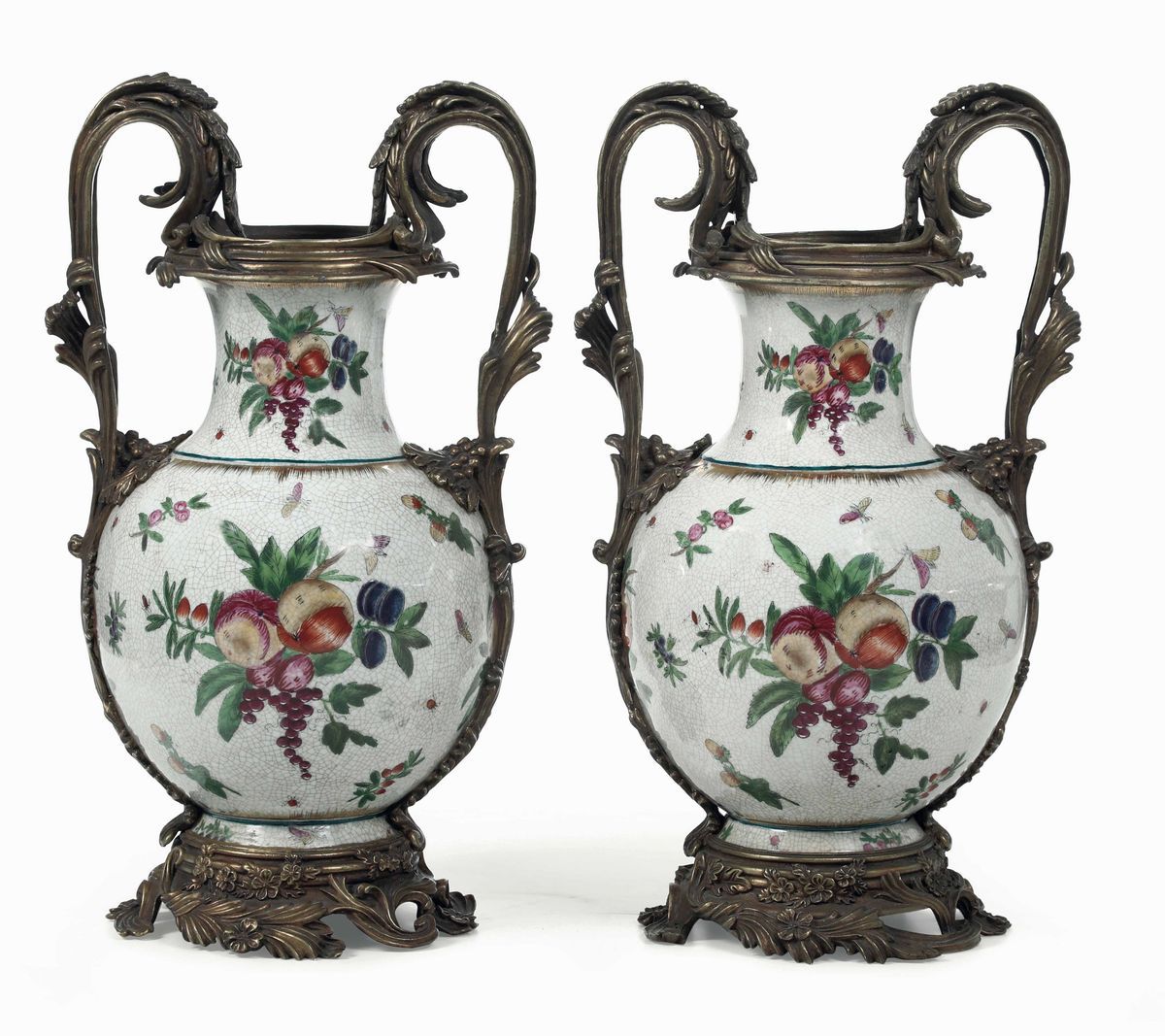 Maiolica decorata a fiori sparsi policromi, montatura in bronzo.
