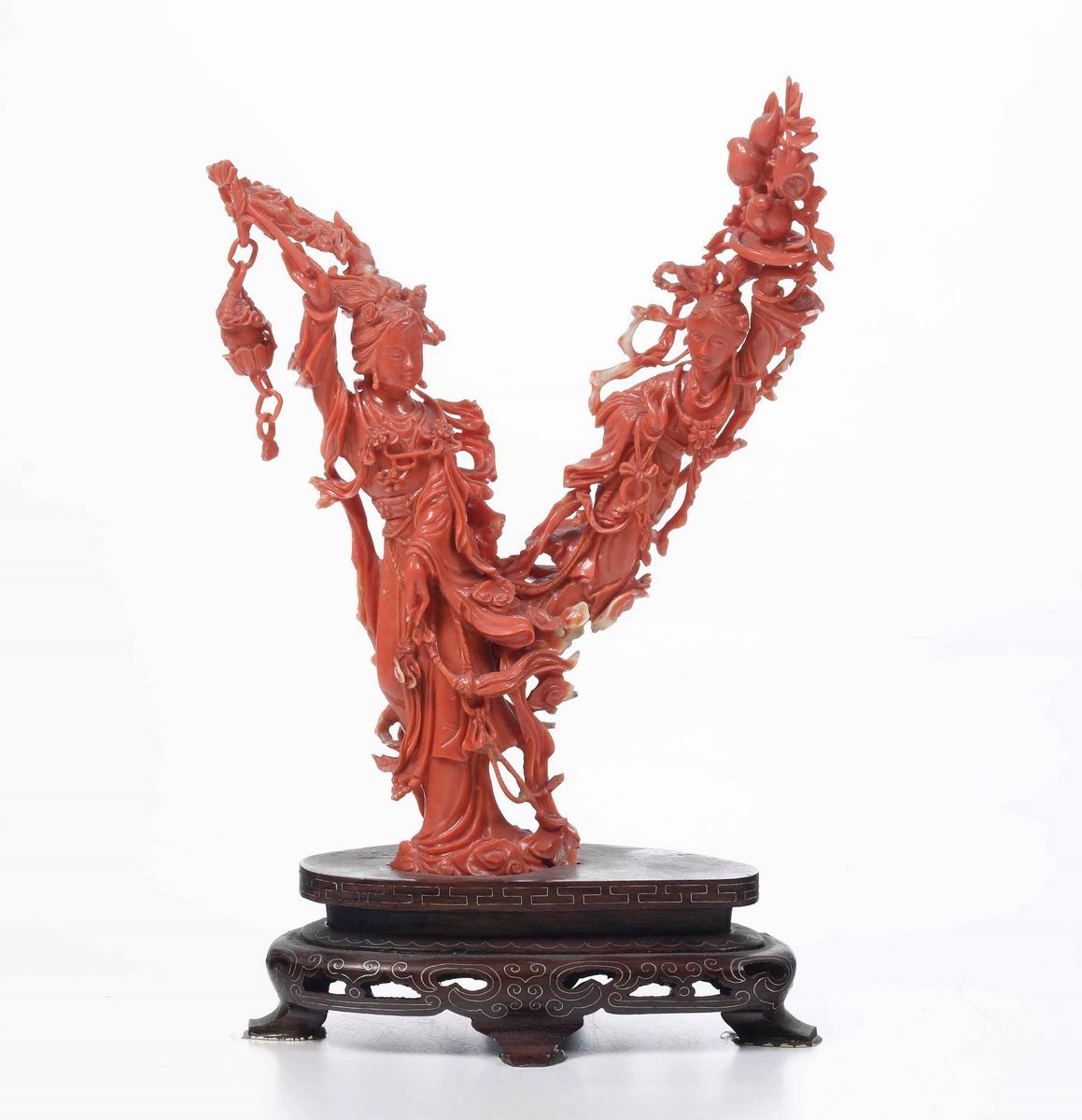 Gruppo scolpito in corallo raffigurante fanciulle tra rami in fiore, Cina, inizi XX secolo