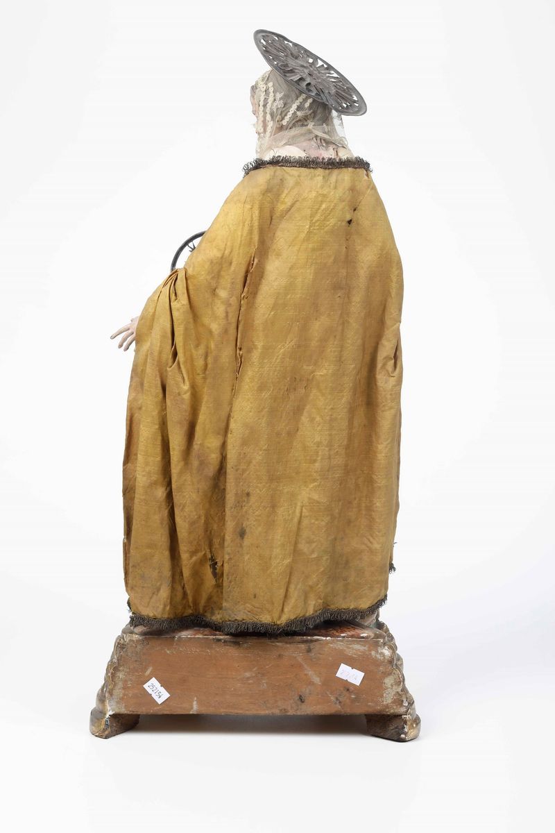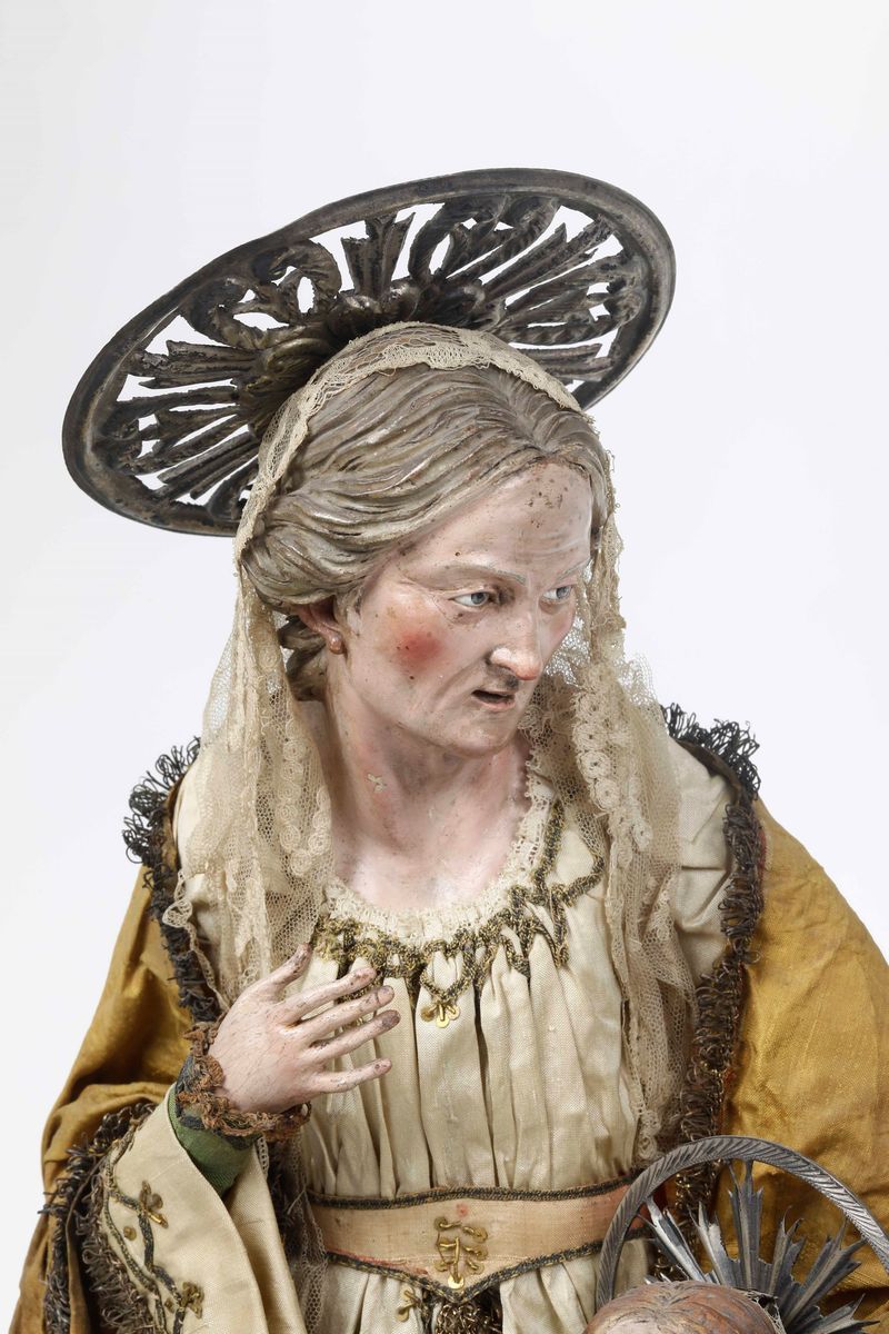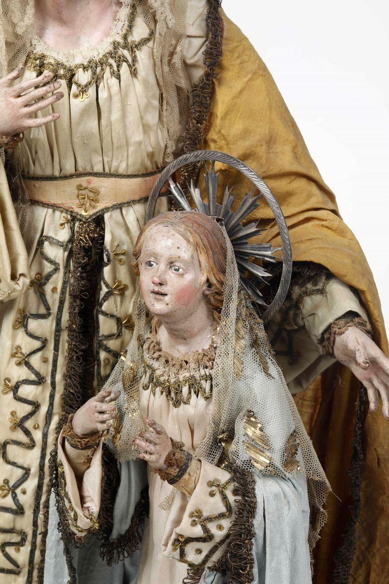 Figure di Sant'Anna e della Vergine bambina in terracotta con occhi in vetro, vesti in seta, aureole in metallo argentato.