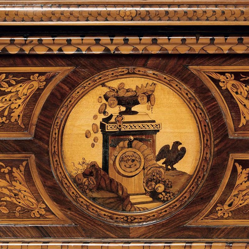 La ghirlanda floreale contenente fiori di vario tipo riprodotti in diverse tonalità conferma la propensione, propria dell’ebanista, a riprodurre veridicamente le specie botaniche. Lungo il bordo del piano corre un fregio di fiori che si susseguono e subito sotto una sottile fascia a dentelli. Il fronte, i cassetti e i fianchi si arricchiscono di intarsi a volute fitomorfe elaborate in un’alternanza di fiori e foglie d’acanto. Anche gli antemioni sui montanti sono resi da un intarsio fitto e raffinato.