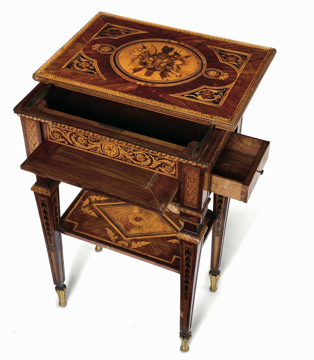 Lastronato, filettato e finemente decorato ad intarsio in essenze pregiate naturali e tinte. Piano rettangolare scorrevole centrato da panoplia allegorica, cassetti e tiretti sul fronte e sui fianchi, gambe troncopiramidali riunite da pianetto, piedi a foglie d’acanto in bronzo fuso, cesellato e dorato