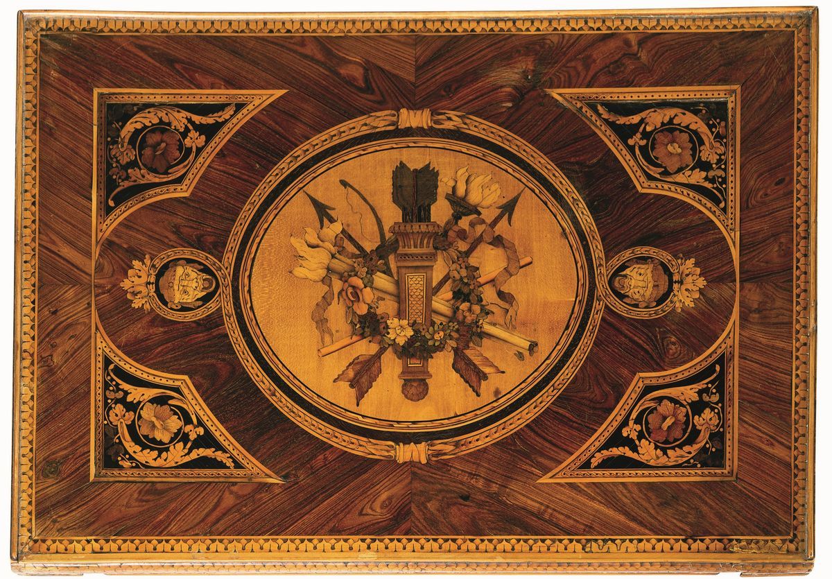 Da sottolineare il piano centrato da un ricco trionfo con ghirlanda e fiaccole, decorato da intarsi leggeri e minuziosi, eseguito con piccole variazioni di tessere di essenze lignee con delicate ombreggiature, incorniciato dai mascheroni e dal medaglione di campanule che si rincorrono; sono tutti elementi riconducibili alla produzione di Maggiolini.