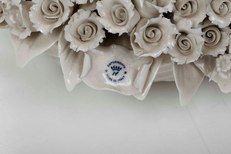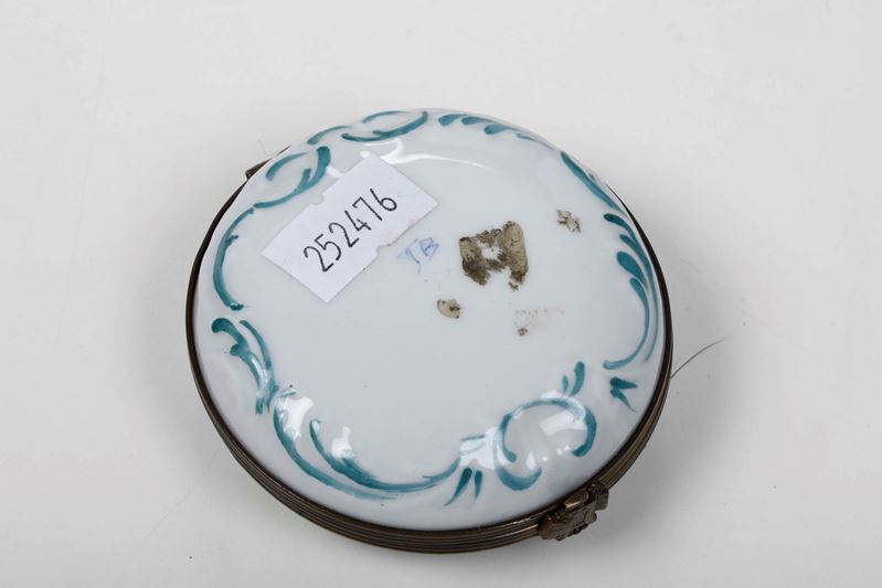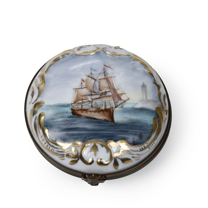 Composto da un centrotavola e due figure Capodimonte, un gruppo in biscuit e una scatola in porcellana dipinta con veliero inscritta Marine Royale