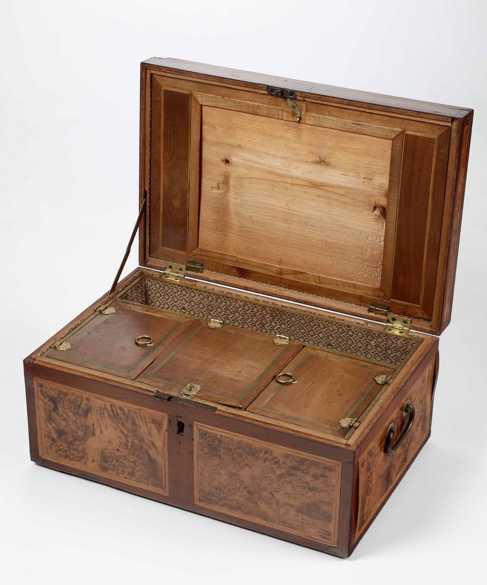 Lastronato in radica di tuia e filettato. Coperchio decorato in policromia a paesaggio con architetture. Vani e cassettini all'interno