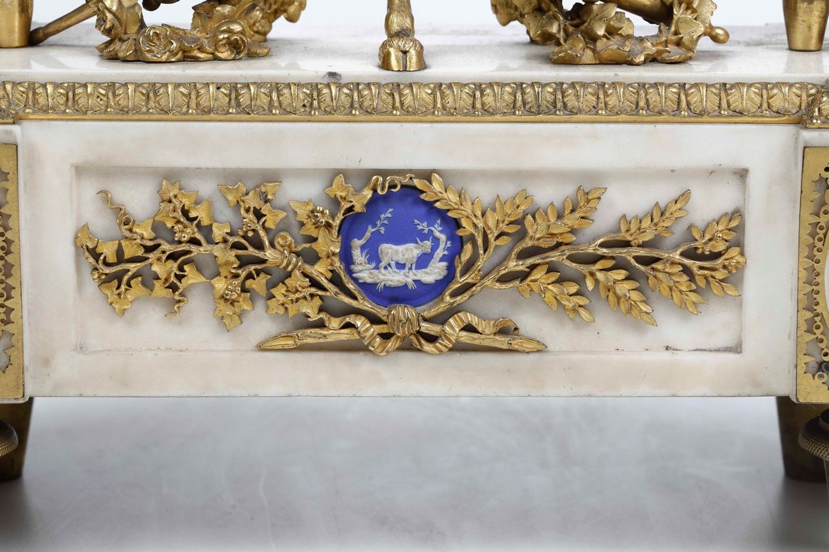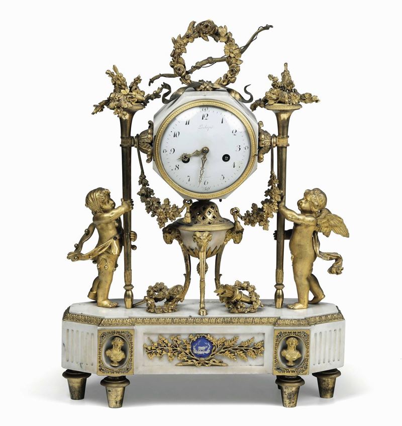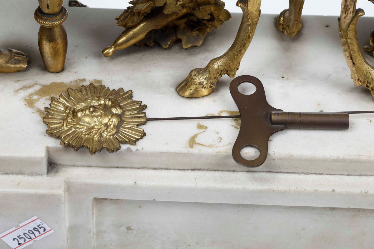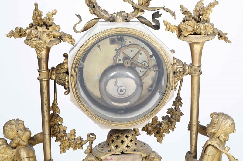 Pendola da tavolo in marmo bianco e bronzo dorato. Francia, XVIII secolo