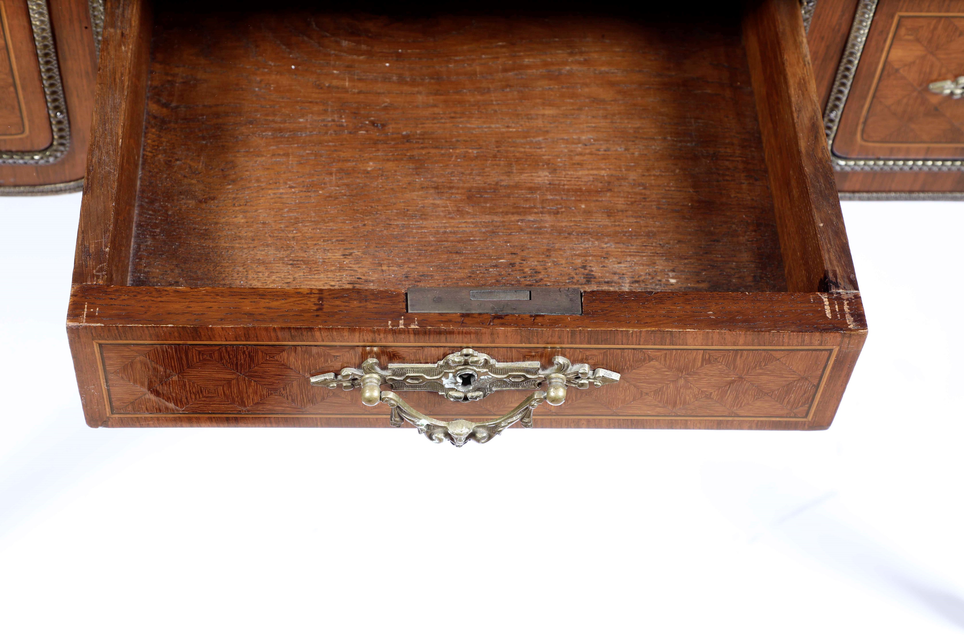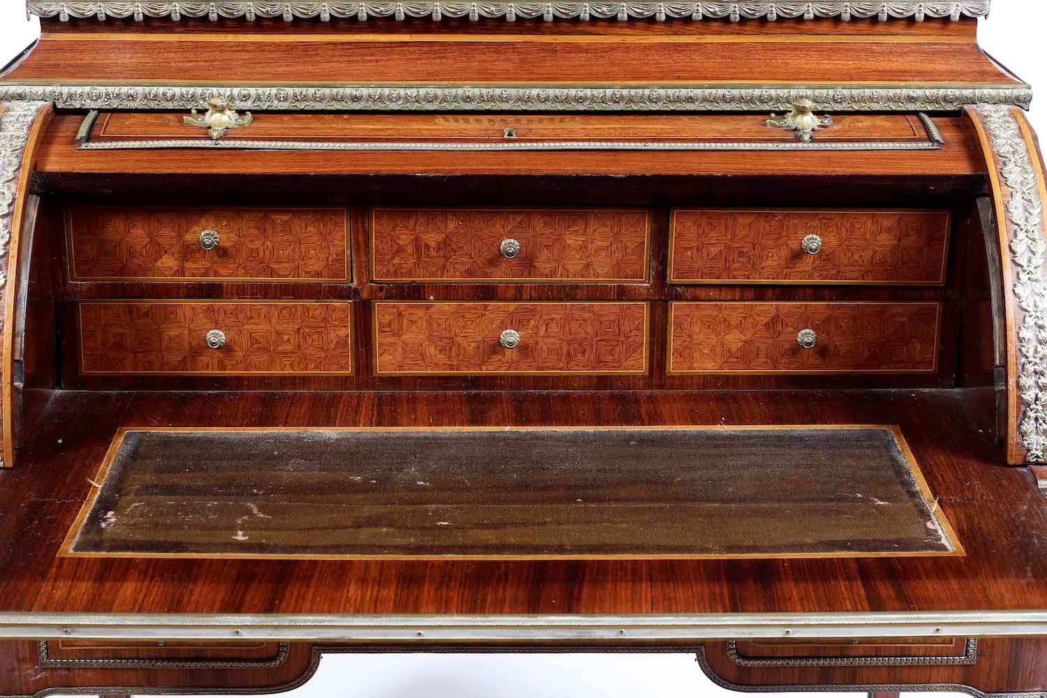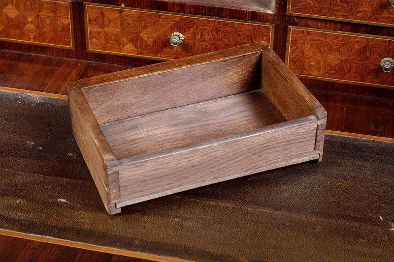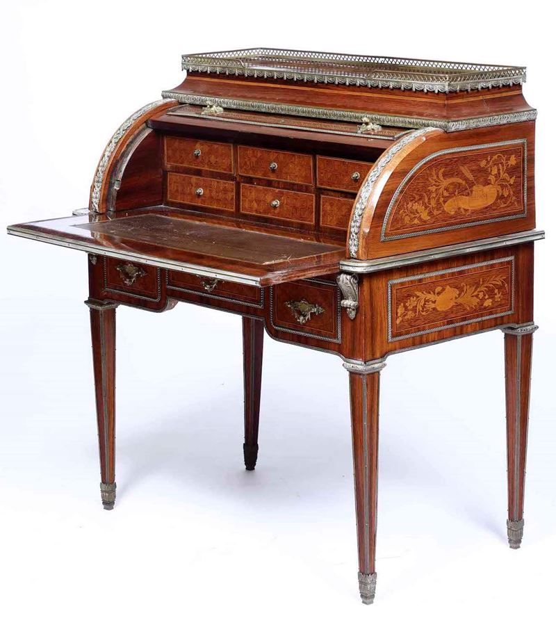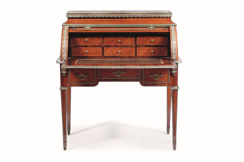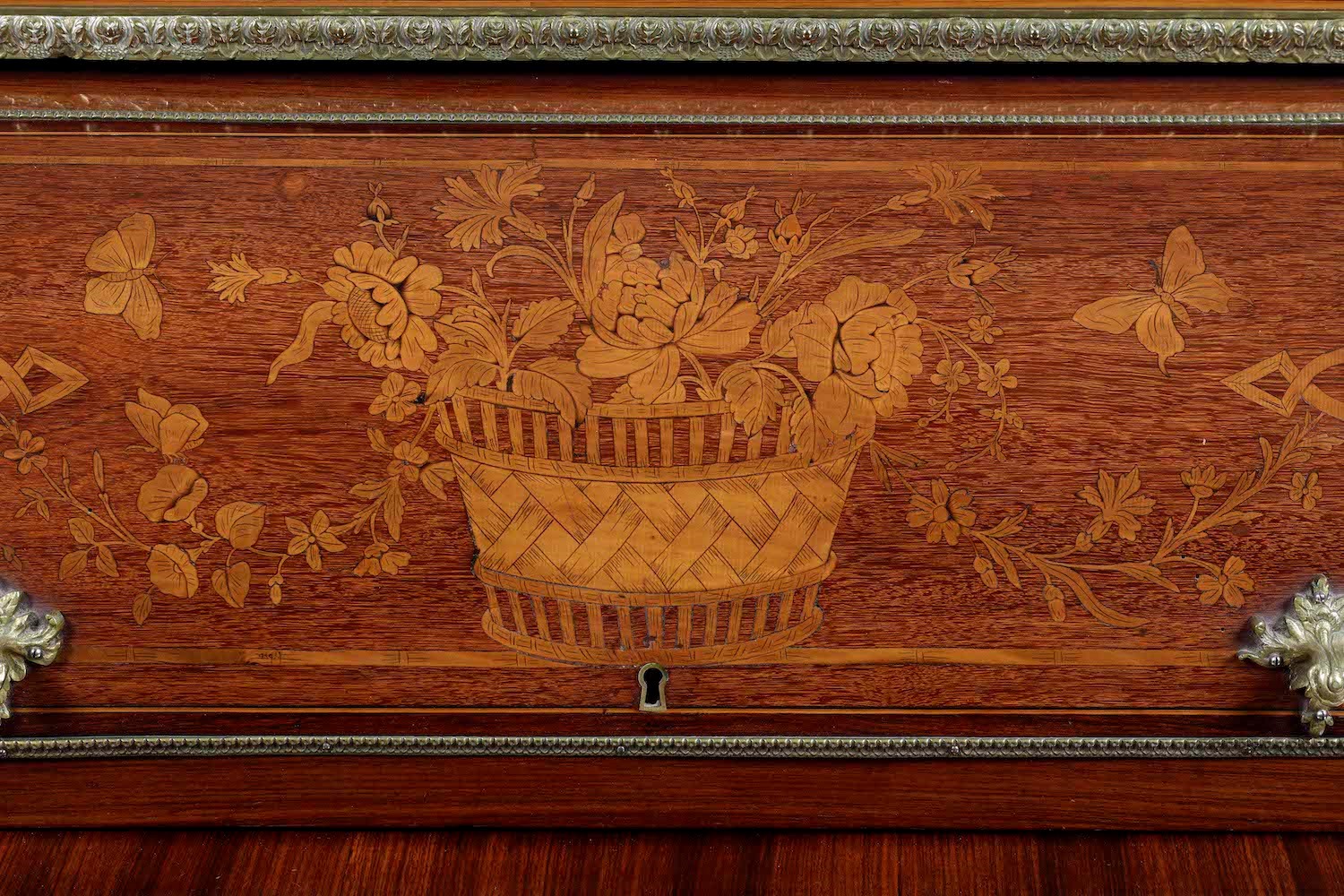 Fronte a tre cassetti, pianetto scrittoio estraibile rivestito in pelle, anta a rullo celante sei cassettini, piano incorniciato da ringhiera traforata e arricchita da modanatura di drappi con nappe. Cassetti decorati a marqueterie, anta intarsiata a cesto di frutta, ghirlande di fiori e farfalle, fianchi con simboli allegorici della scrittura. Applicazioni, profili e scarpette in bronzo dorato