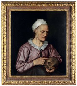 Scuola tedesca del XVII secolo Ritratto di anziana con teschio
