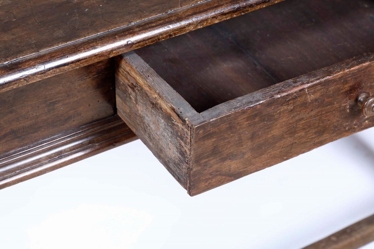 Tavolo in noce con gambe a rocchetto, elementi antichi
