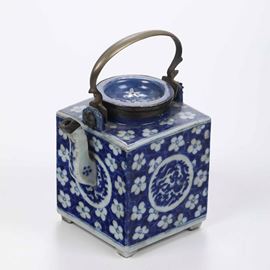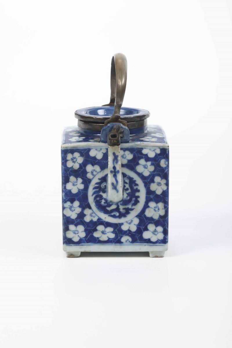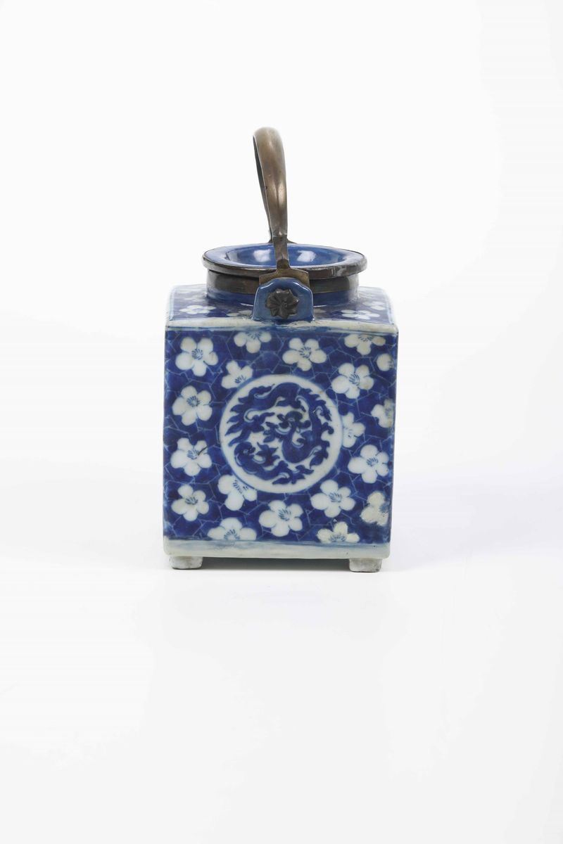 Teiera in porcellana bianca e blu con decori floreali e figure di draghi entro riserve, Cina, Dinastia Qing, epoca Qianlong [..]