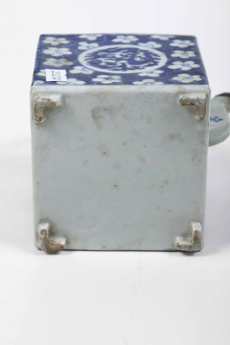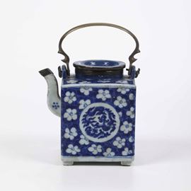 Teiera in porcellana bianca e blu con decori floreali e figure di draghi entro riserve, Cina, Dinastia Qing, epoca Qianlong (1736-1796)