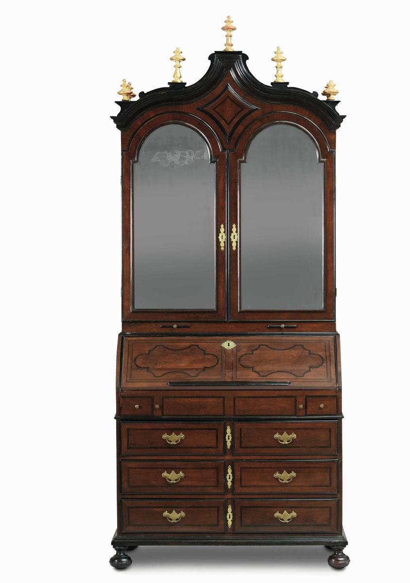 Corpo inferiore a tre cassetti, due cassetti più piccoli sotto il piano a ribalta, alzata con ante a specchio terminanti a demilune, cimasa con pinnacoli torniti e dorati sulla sommità. Maniglie e bocchette in bronzo dorato, piedi a cipolla
