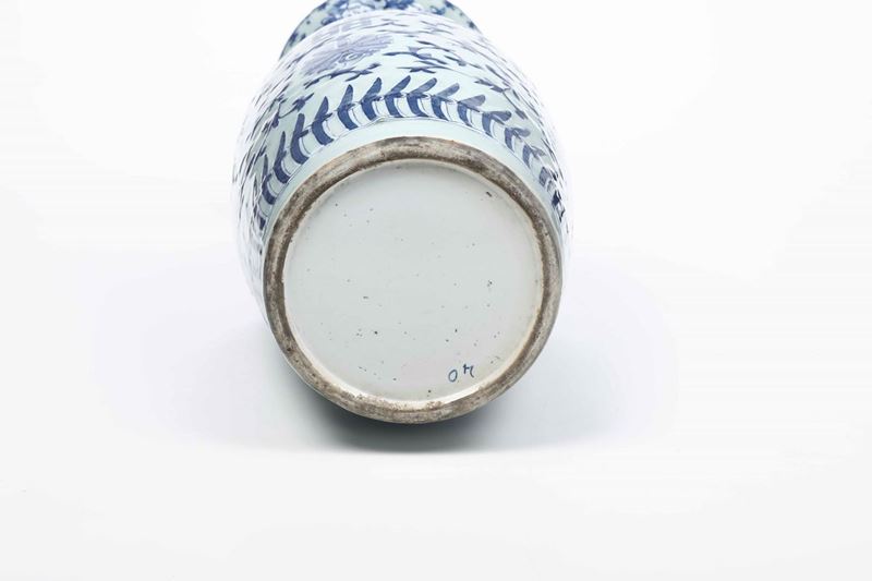 Vaso in porcellana bianca e blu con figure di draghetti a rilievo, decori floreali e ideogrammi, Cina, Dinastia Qing, XIX [..]