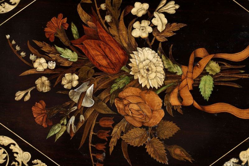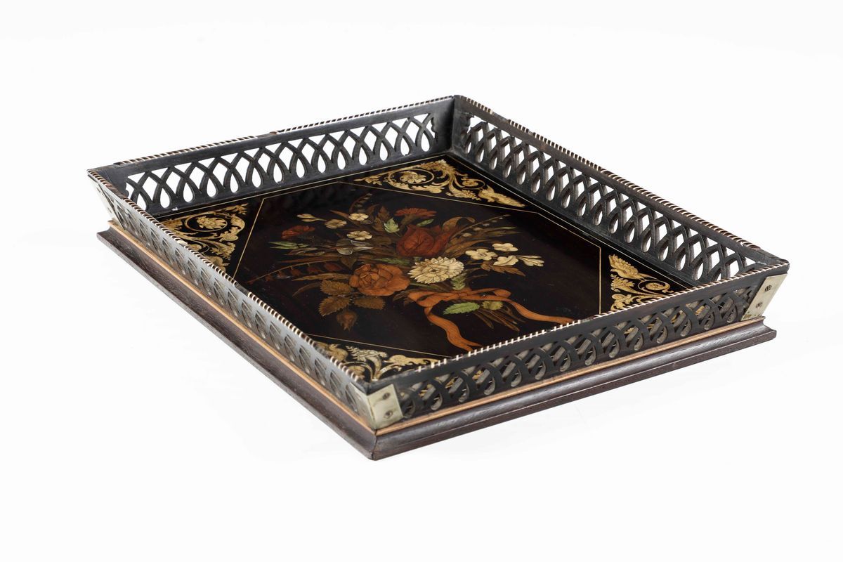 Vassoio in essenze lignee e naturali, bordo traforato. Firenze bottega di Luigi e Angiolo Falcini, metà XIX secolo