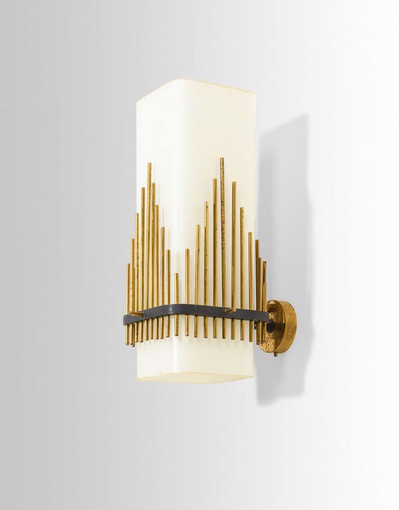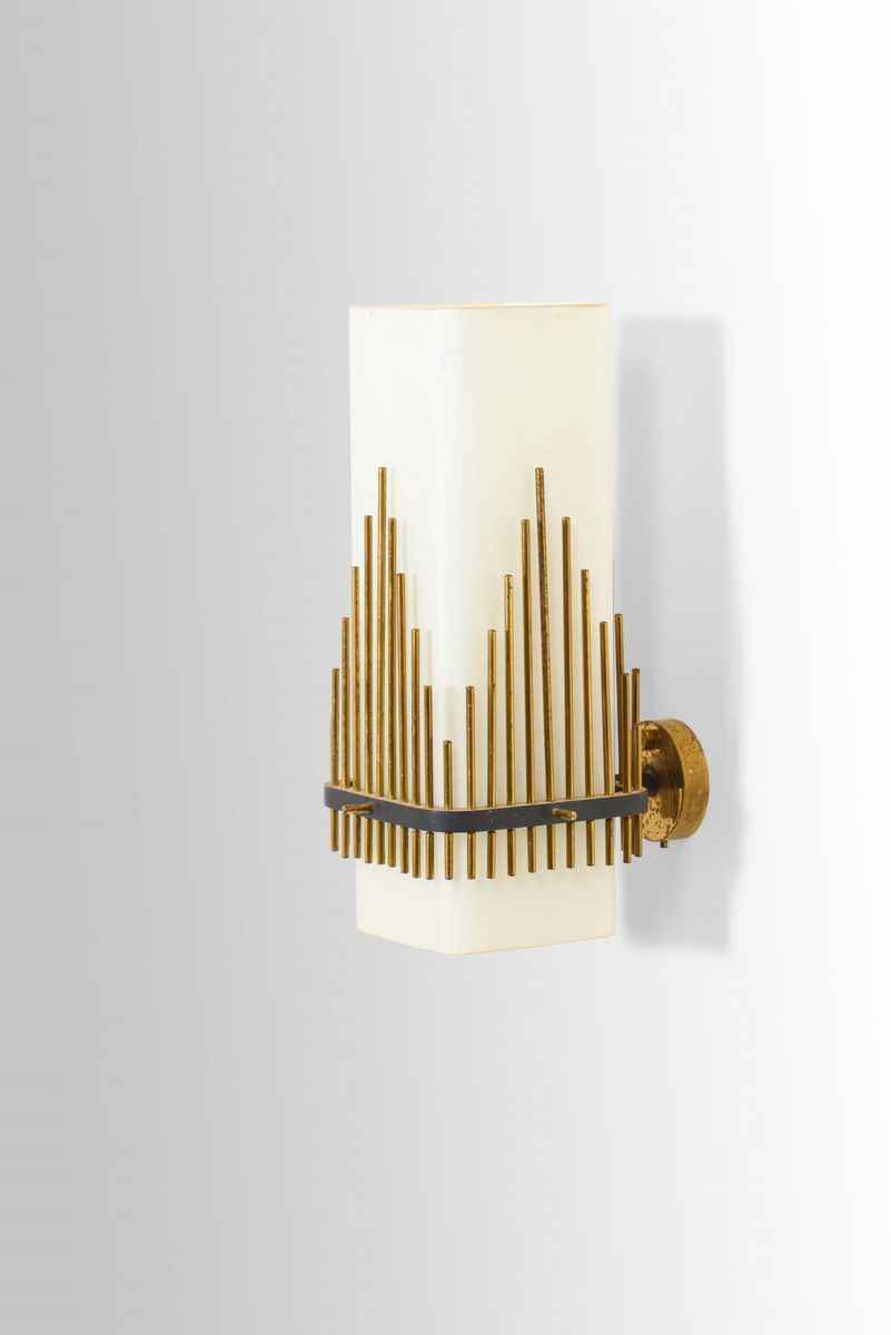 Lampada a parete con struttura in ottone e metallo laccato, diffusore in vetro opalino satinato.