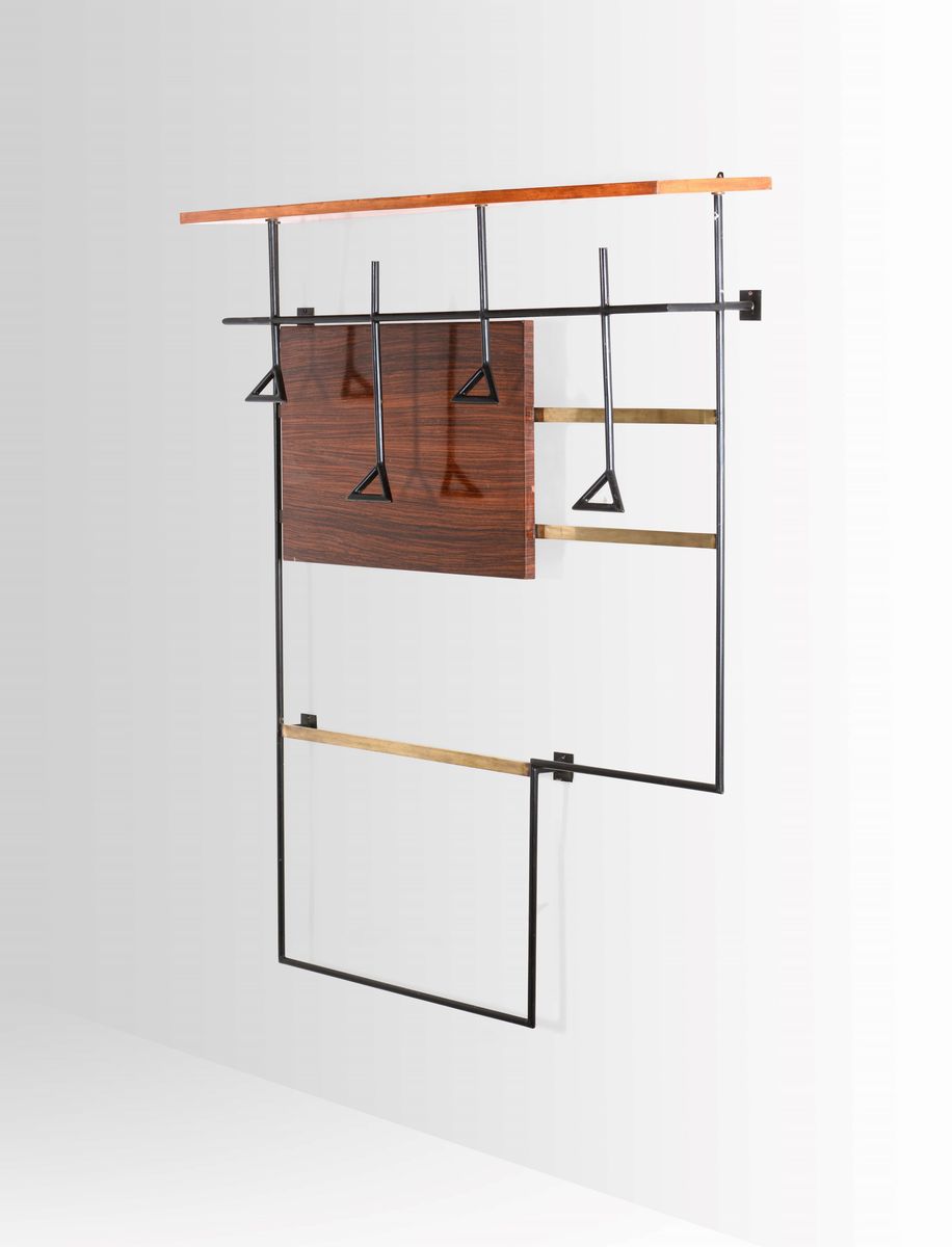 Appendiabiti a parete con struttura in metallo laccato, piano in legno e particolari in ottone.