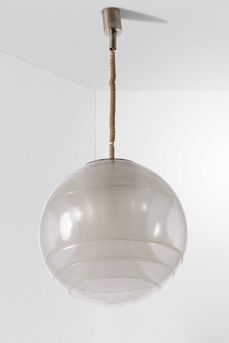 Lampada a sospensione in vetro di Murano a bollicine particolari in metallo cromato.
