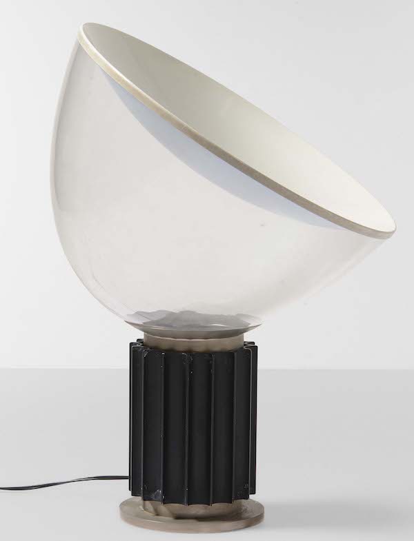 con base in travertino e struttura in metallo nichelato. Diffusore ad altezza regolabile. Prod. Oluce, Italia, 1954.