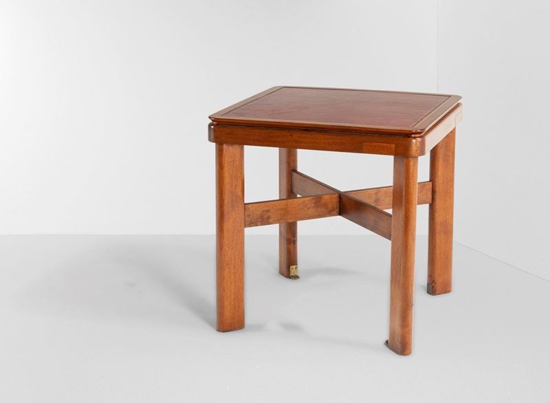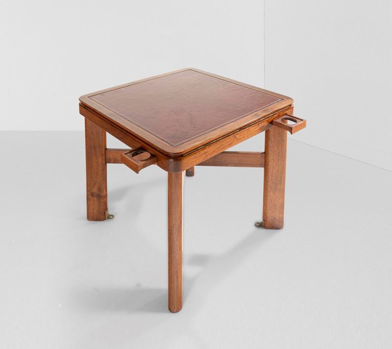 Tavolo da gioco con struttura in legno, piano in cuoio e cassetti portabicchieri estraibili.