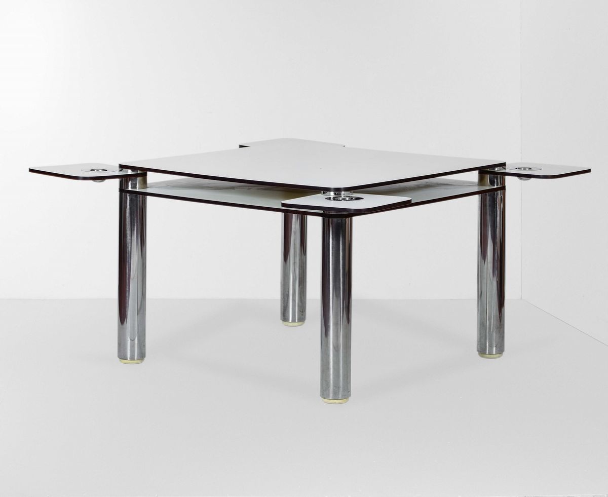 Tavolo quadrato mod. Poker con struttura in acciaio e piani in laminato plastico stratificato. Portabicchieri angolari estraibili.