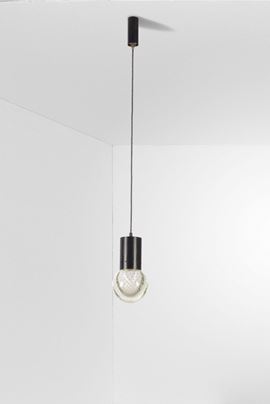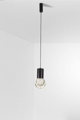 Tre lampade a sospensione con struttura in metallo e diffusore in vetro a bollicine.