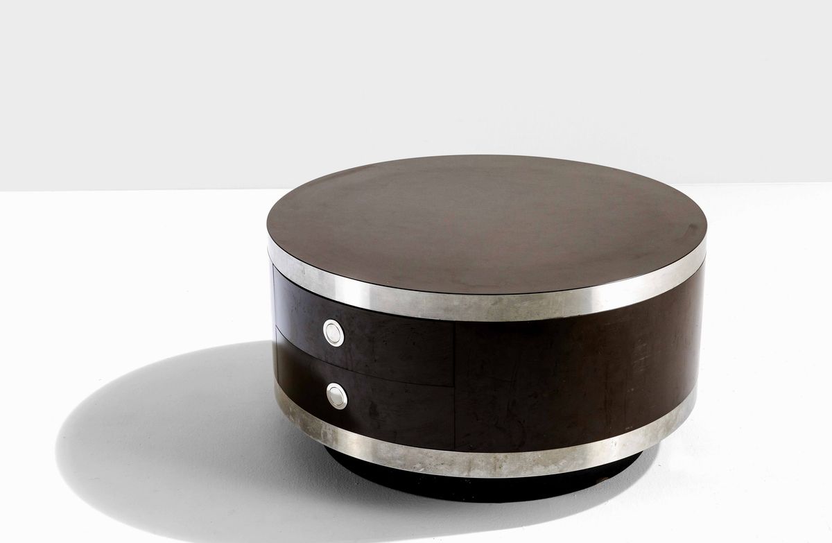 Tavolo basso girevole mod. TNG. Struttura in legno laminato, metallo e acciaio spazzolato.