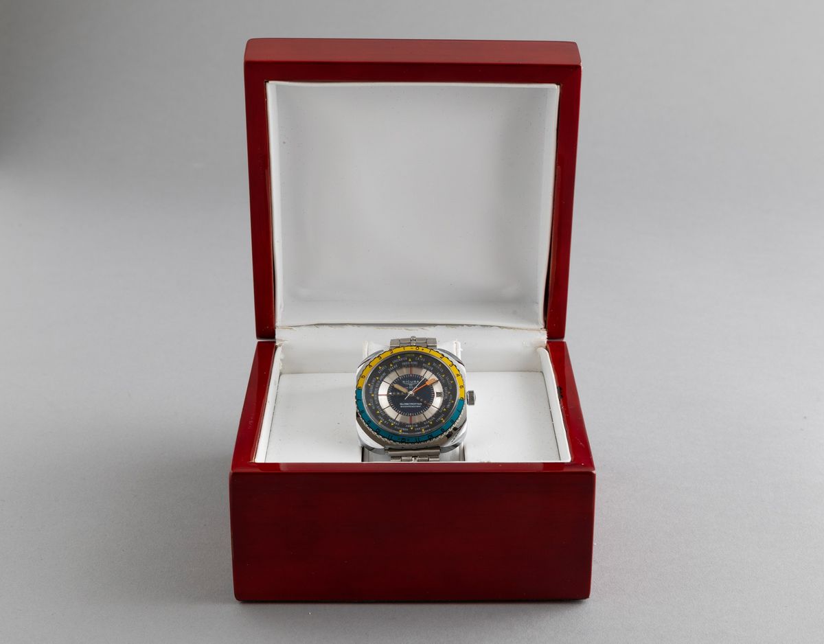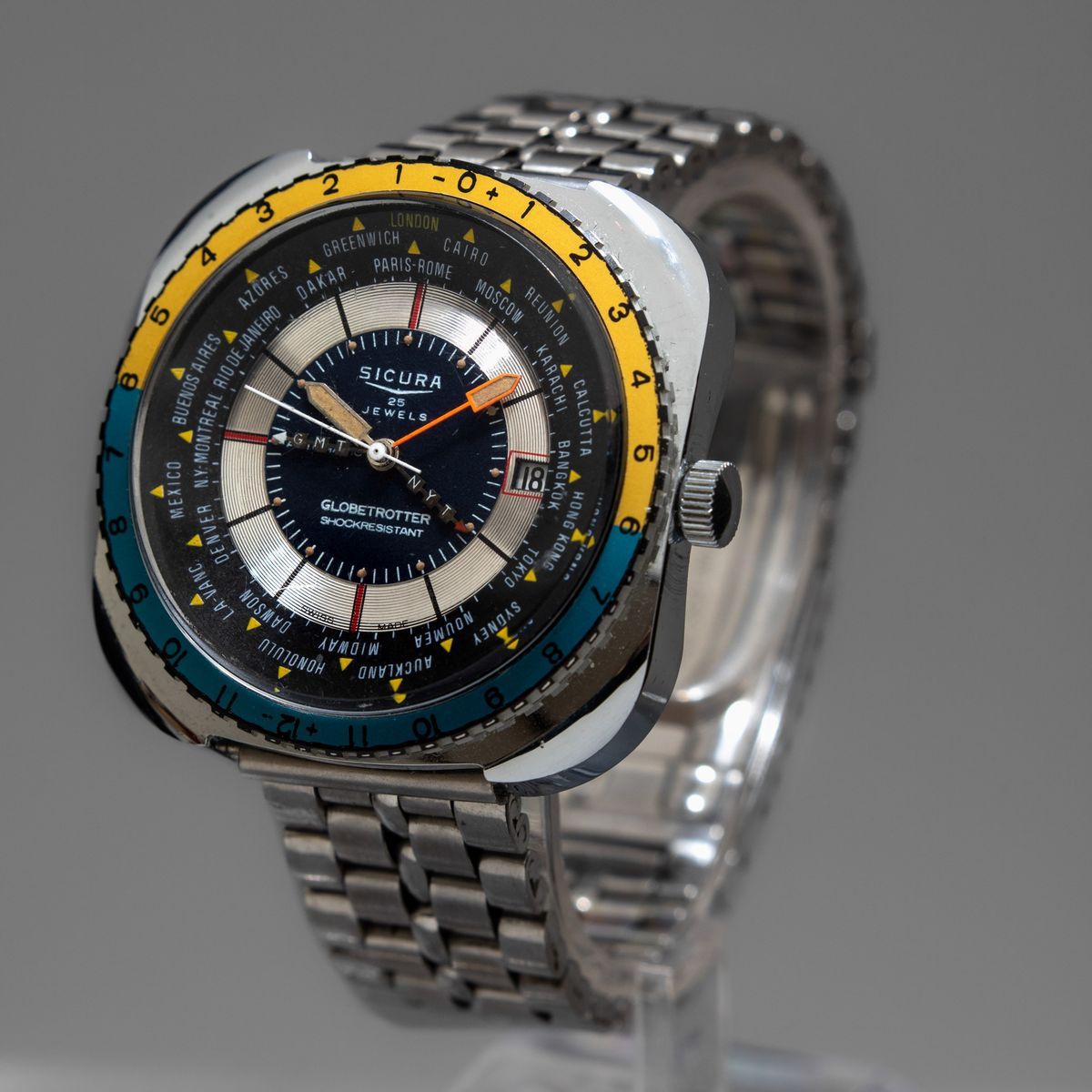 SICURA - Globetrotter, orologio ore del mondo anni '70 con cassa in acciaio oversize