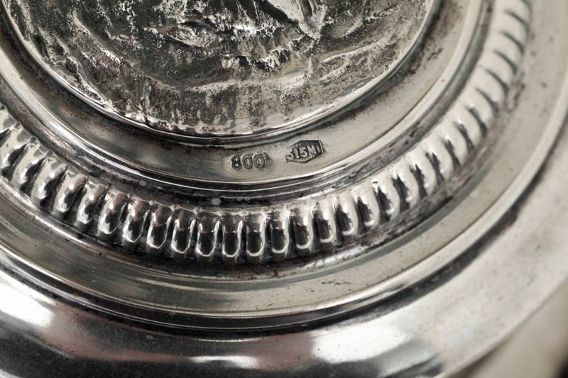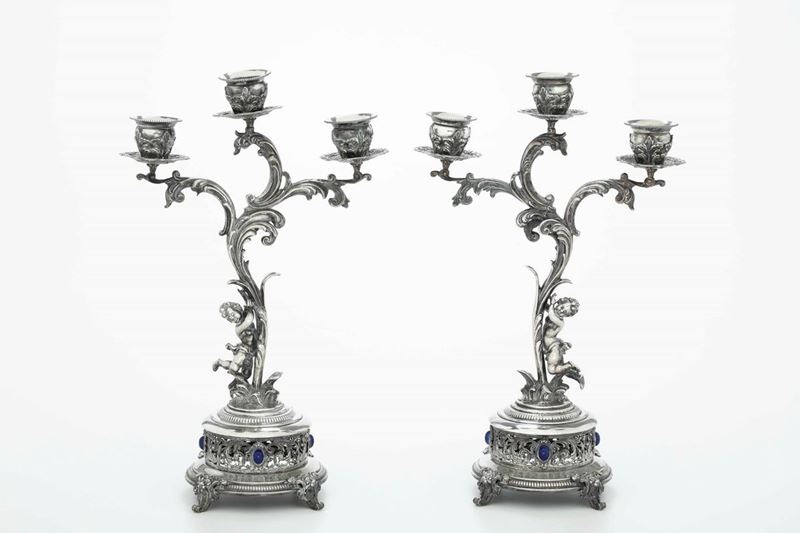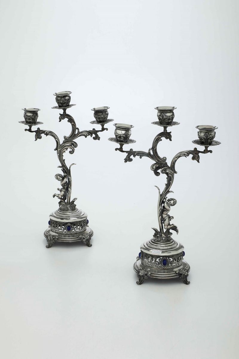 Coppia di candelabri in argento. Argenteria artistica italiana del XX secolo. Argentiere Gaetano Tadiello