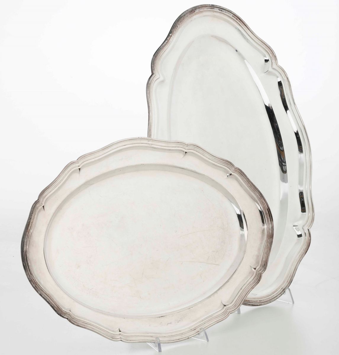 Due vassoi ovali uno in argento e uno in metallo argentato. Argentiere Gianni Pietrasanta, Alessandria