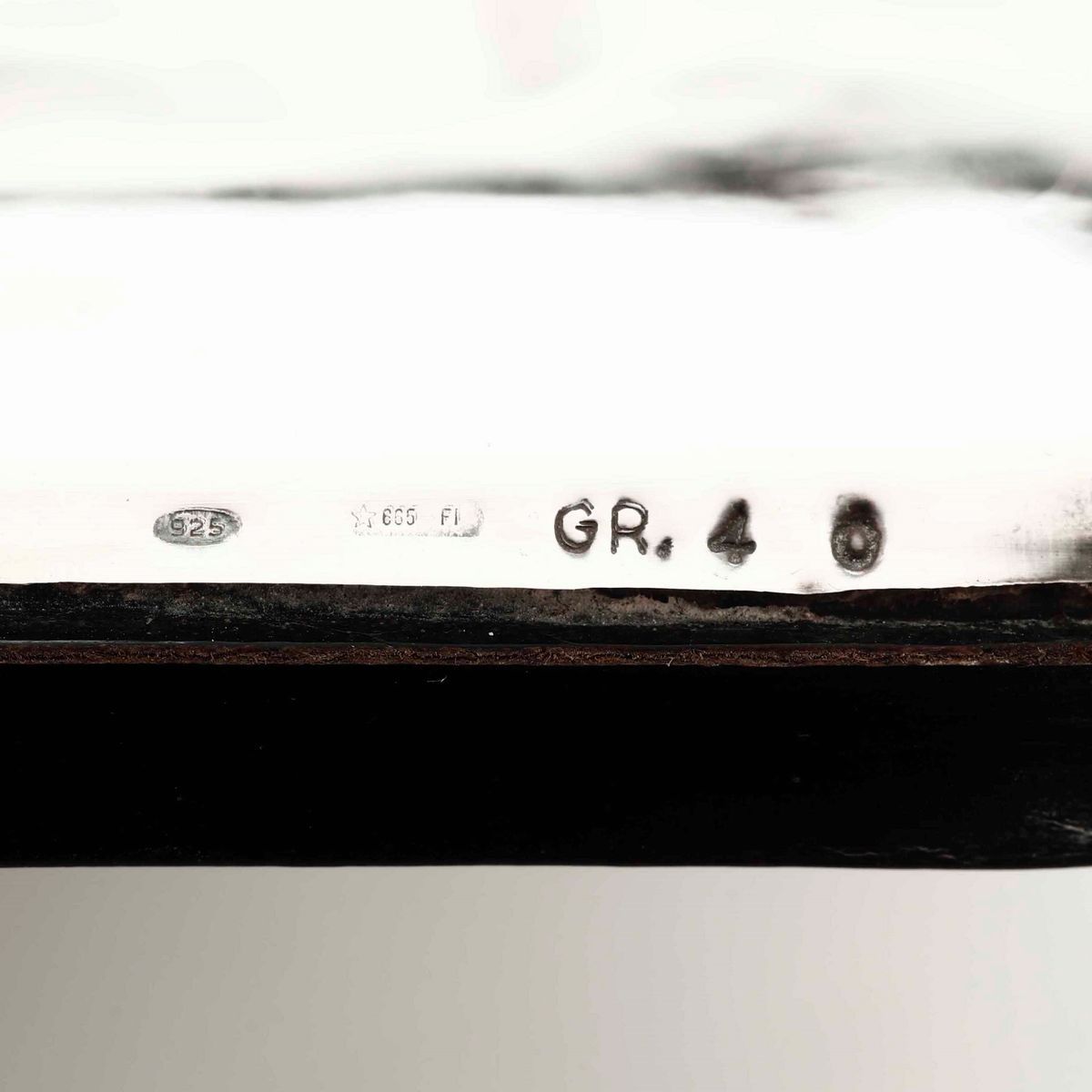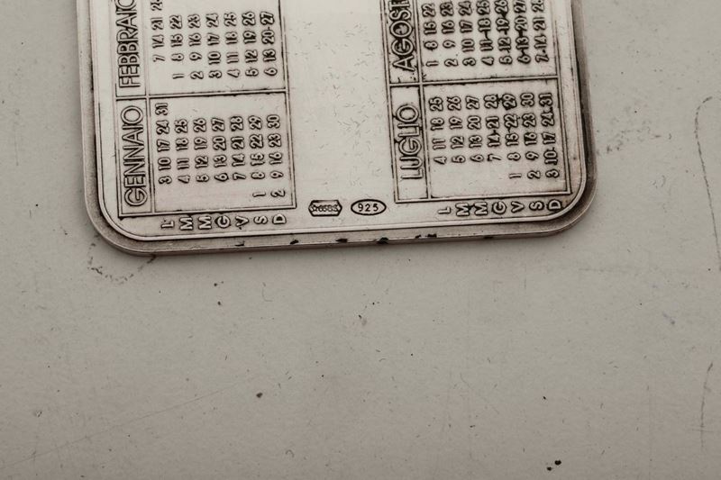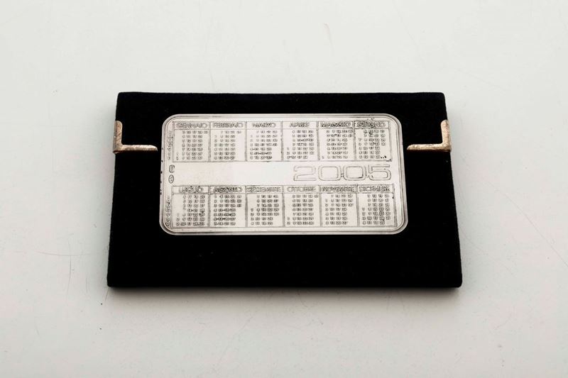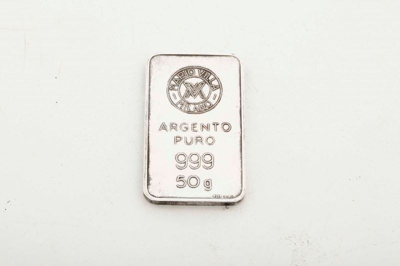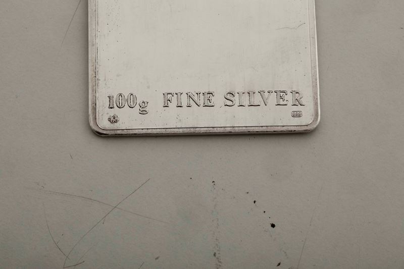 composto da due posapenne in argento 925 83 cm 23,5x10 e cm 18,5x13, Un lingotto in argento 925 87 mm 50x80, gr. 50, Un lingotto in argento 999 88 gr. 100, mm 117x53x15, Un lingotto in argento 999 89 mm 57x33x3, gr. 50