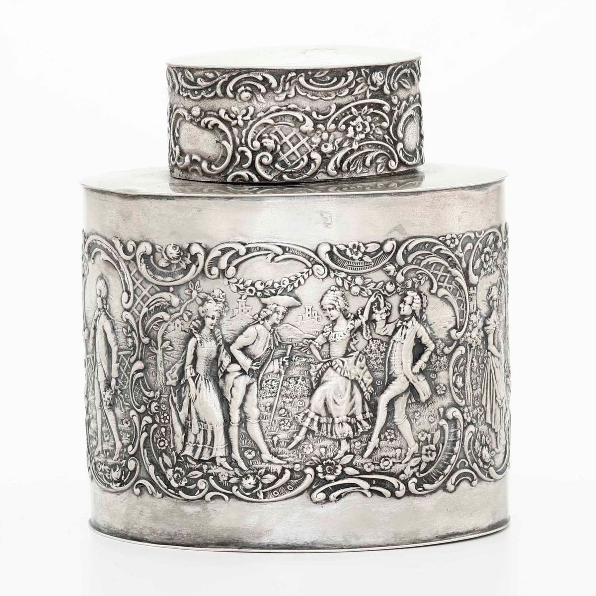 Scatola porta tè in argento. Manifattura del XIX-XX secolo, una con data incisa "August 27, 1927"