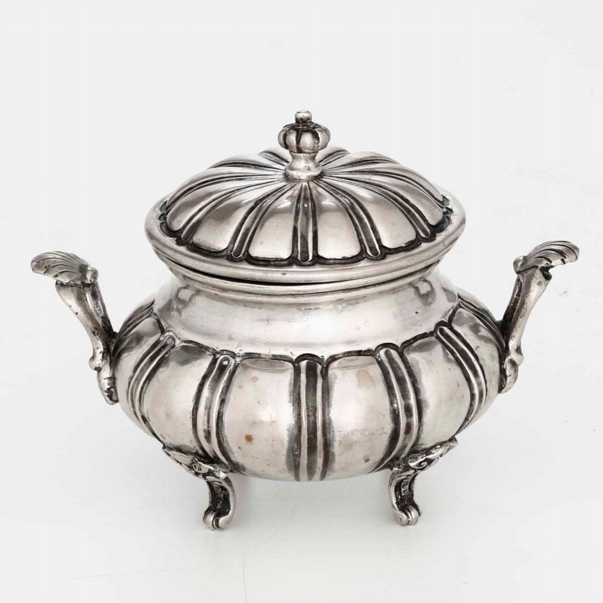 Zuccheriera in argento. Argenteria artistica milanese della prima metà del XX secolo. Bollo con fascio littorio in uso dal 1935 al 1945. Argentiere Dabbene
