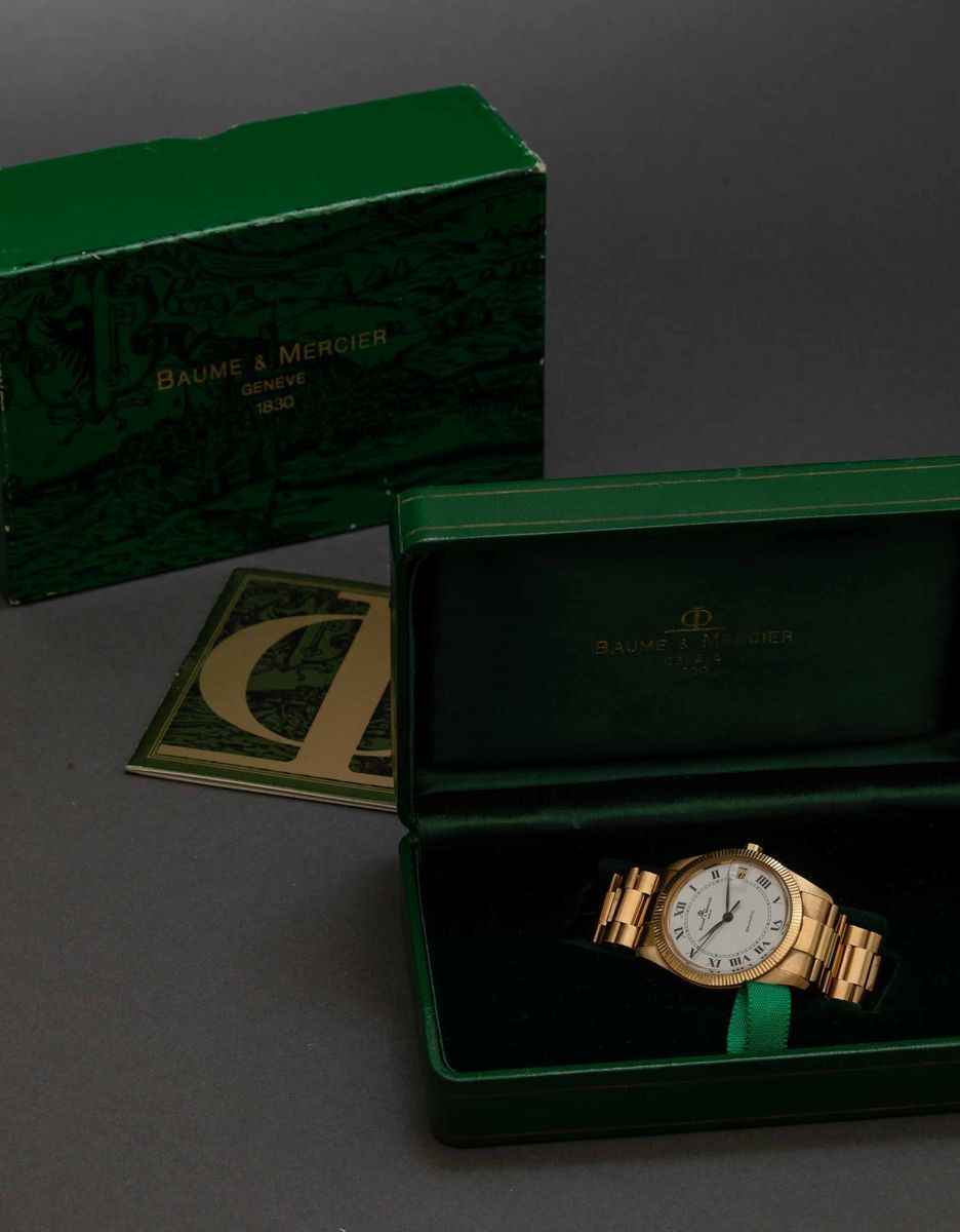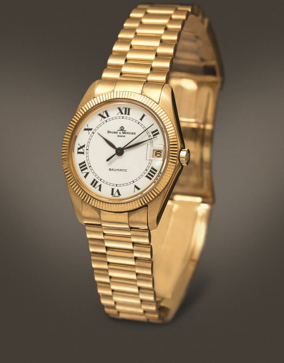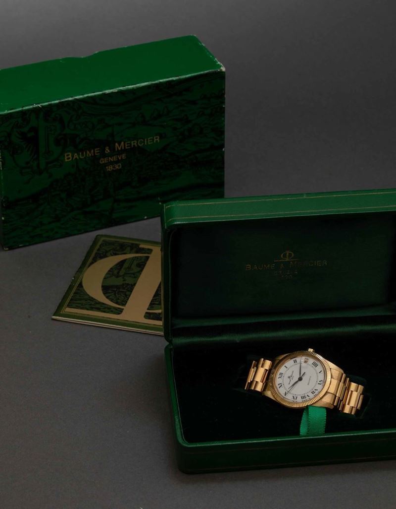 BAUME & MERCIER - Baumatic in oro giallo 18k automatico con datario, quadrante bianco con numeri Romani completo di scatola [..]
