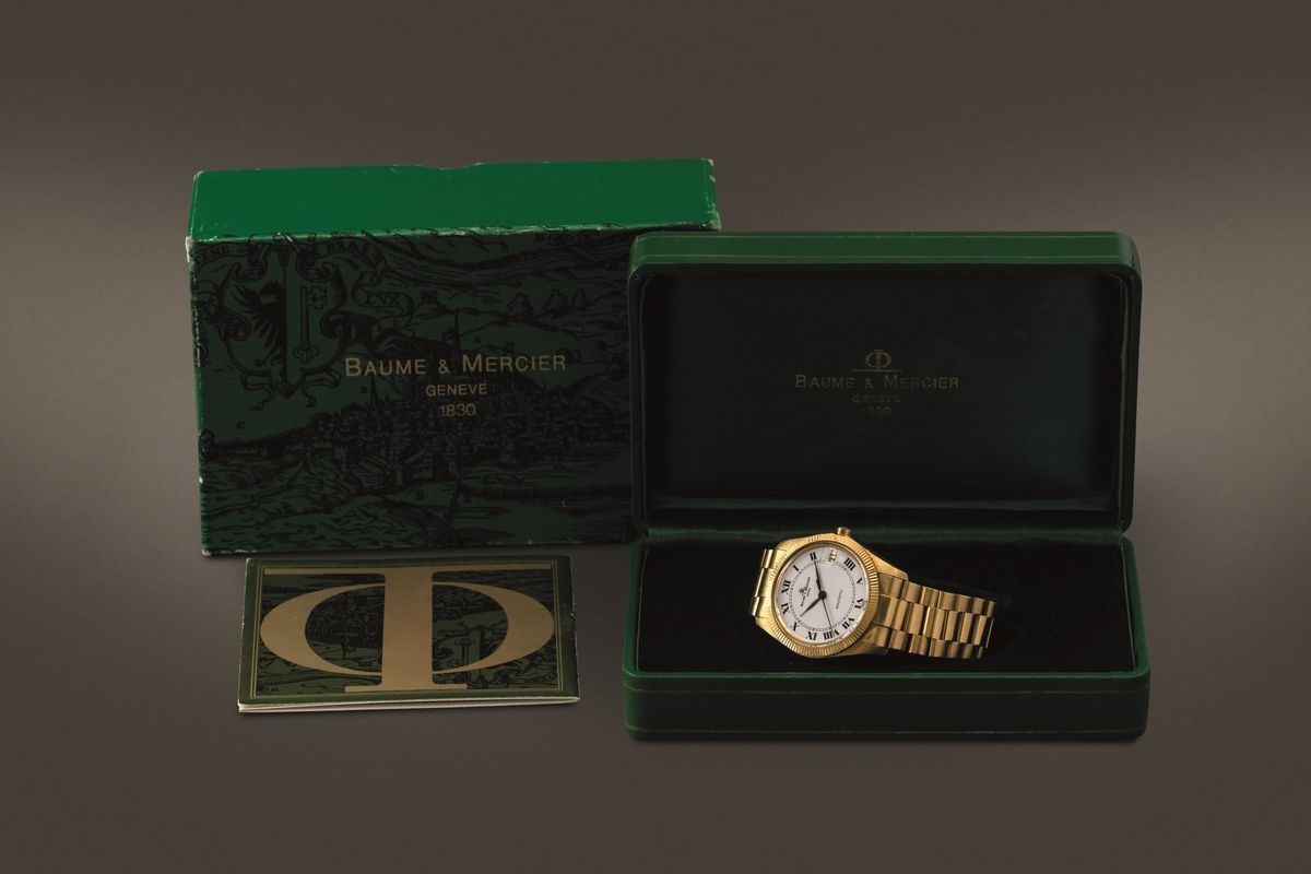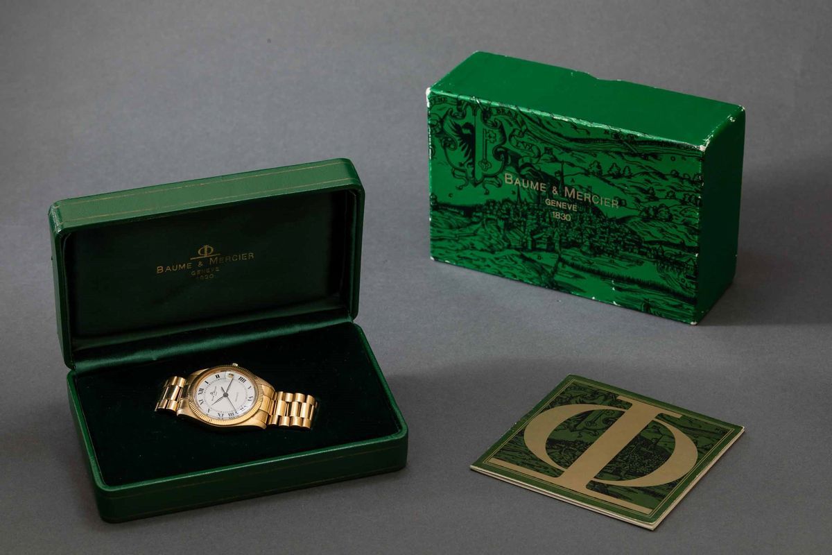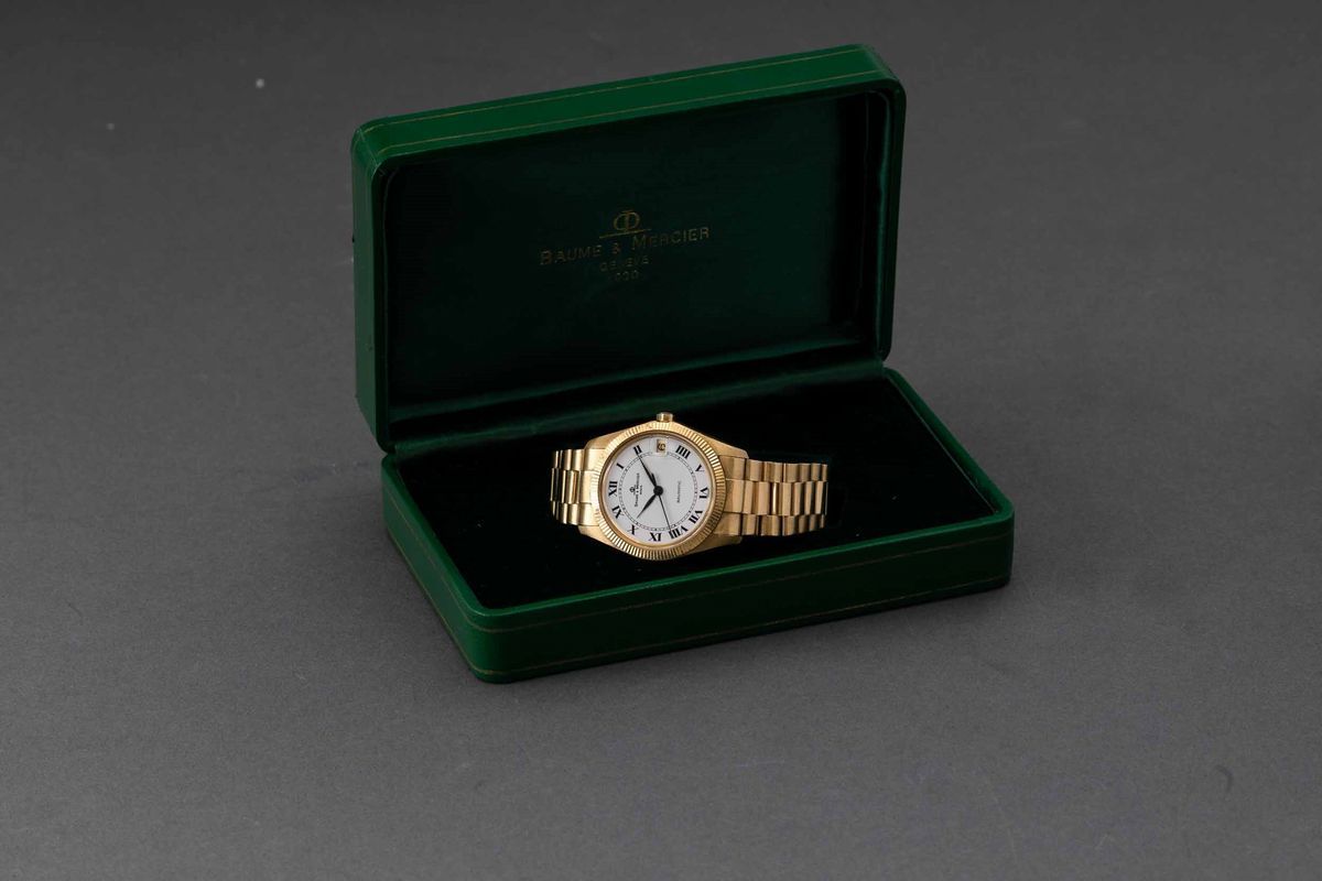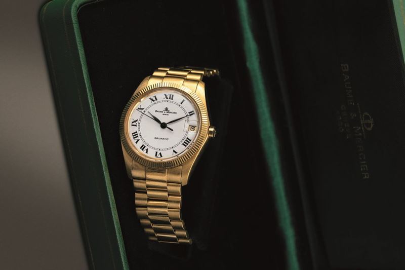 BAUME & MERCIER - Baumatic in oro giallo 18k automatico con datario, quadrante bianco con numeri Romani completo di scatola [..]